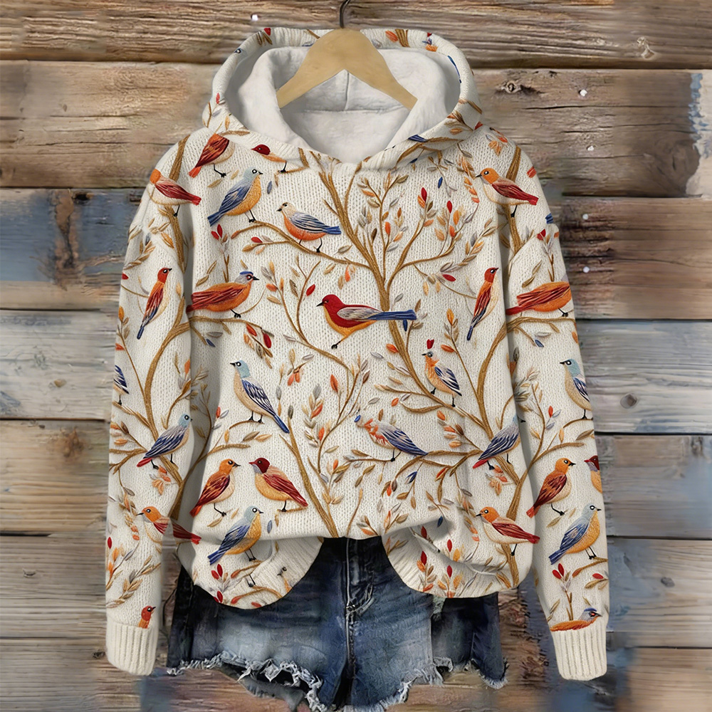 • Cute Birds Art Pattern Cozy Knit Hooded Sweater