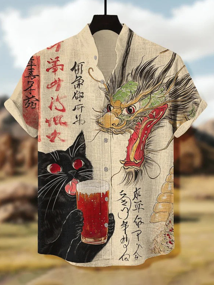 Men's Black Cat Drinking Beer And Dragon Japanese Calligraphy Art Print Casual Shirt