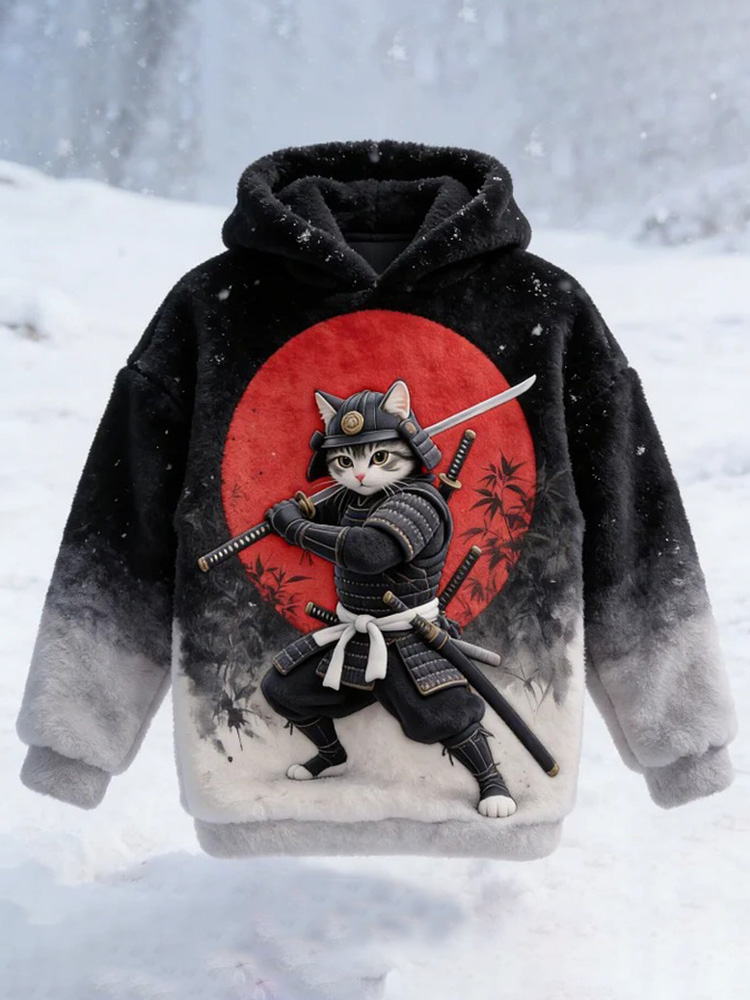 Men's Futuristic Sci-fi Art Mechanical Cat Warrior Japanese Print Casual Flannel Hoodie