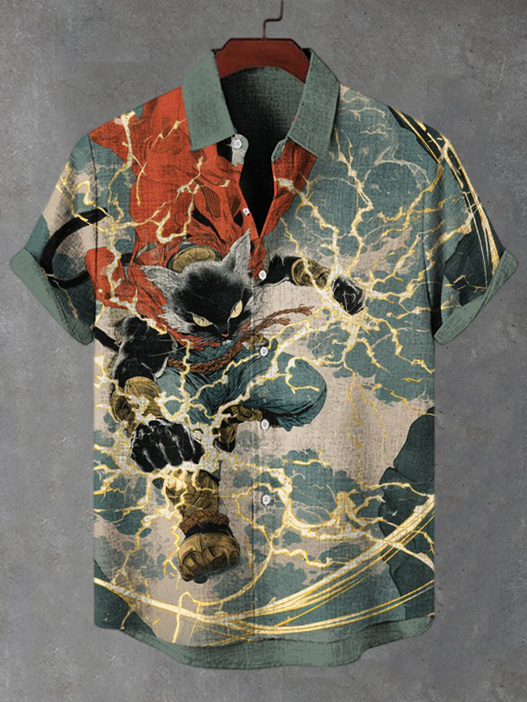 Men's Japanese Black Cat Warrior Art Print Casual Shirt