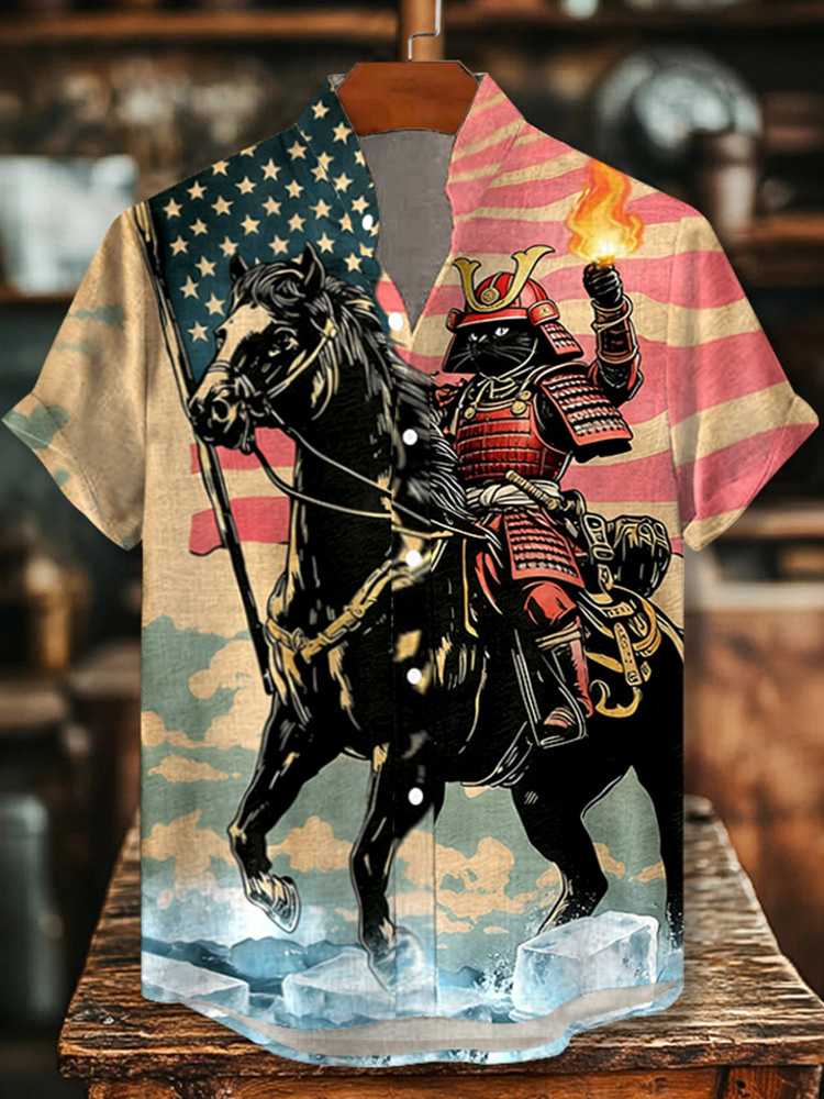 Men's American Flag Robe Cat Ink Painting Short Sleeve Linen Blend Shirt