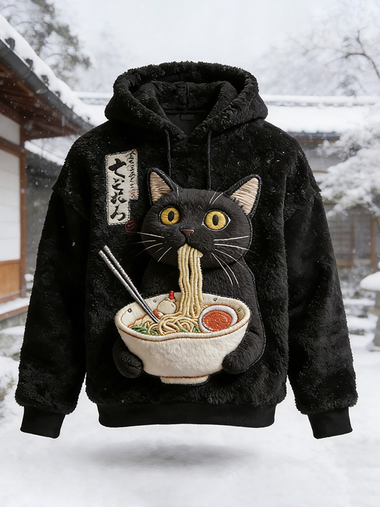 Men's Funny Black Cat Eating Ramen Graphic Japanese Print Casual Flannel Hoodie