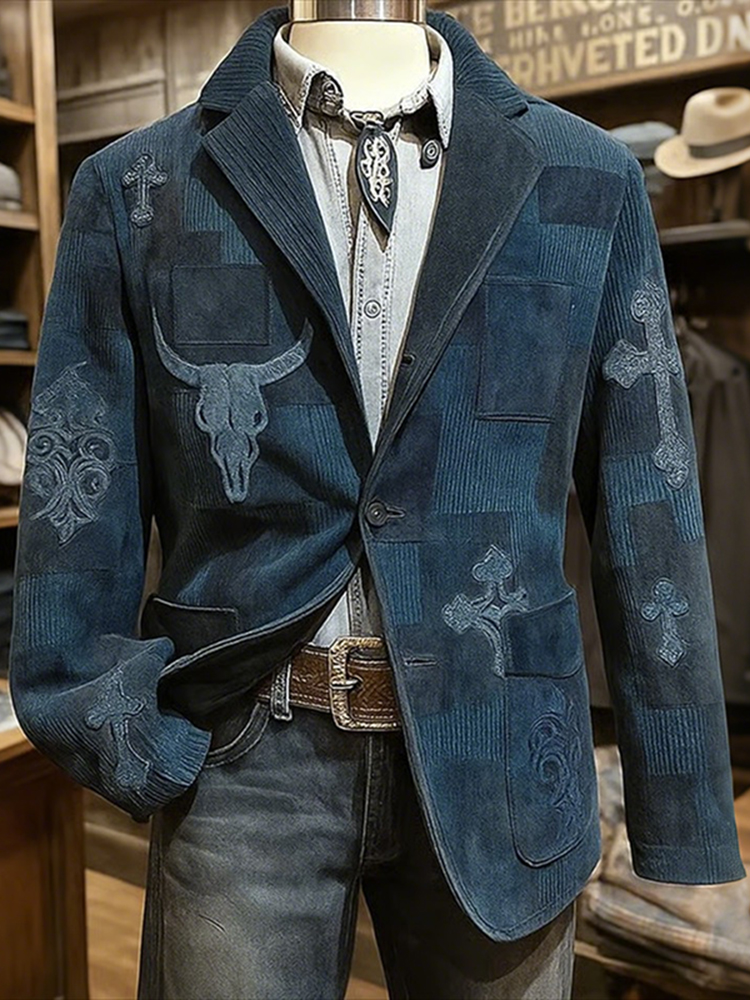 Men's Retro Bull Head And Cross Denim Graphic Corduroy Blazer