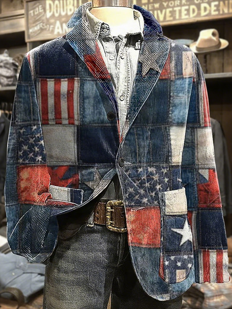 Men's Retro Flag-patterned Color Blocking Graphic Corduroy Blazer