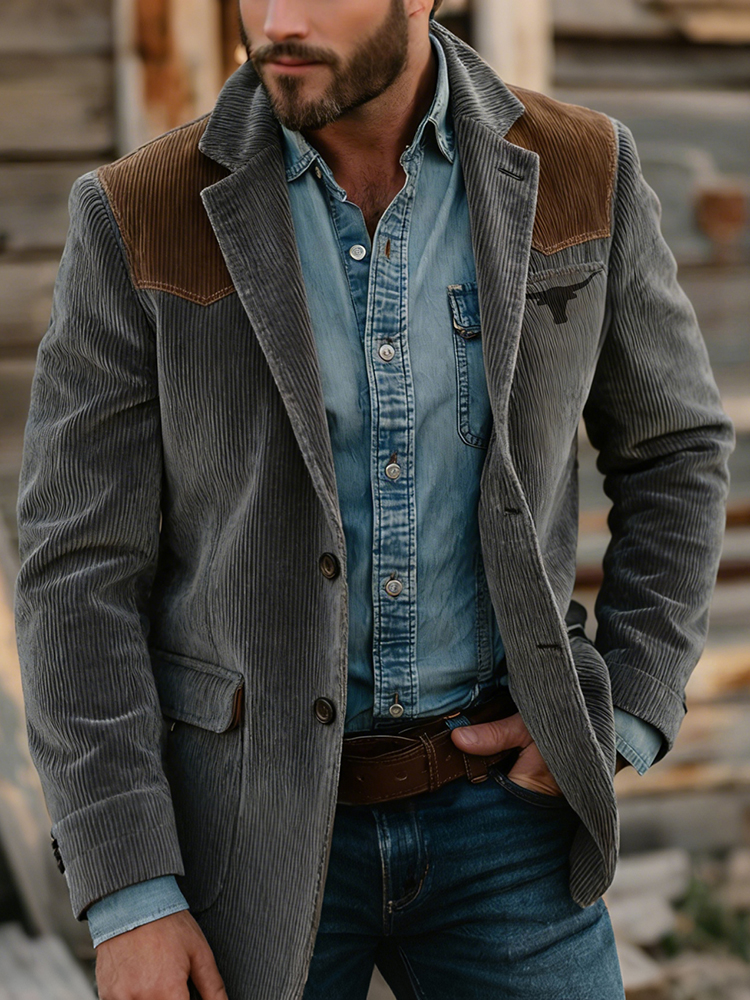 Men's Retro Color-blocked Design Western Texas Corduroy Blazer