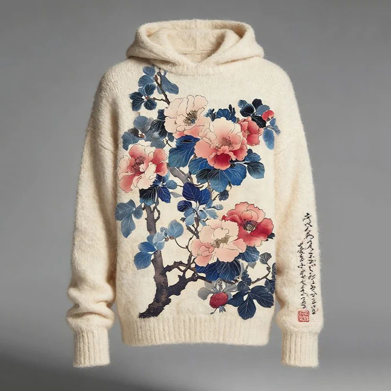 Men's Retro Calligraphy Floral Print Knit Hoodie
