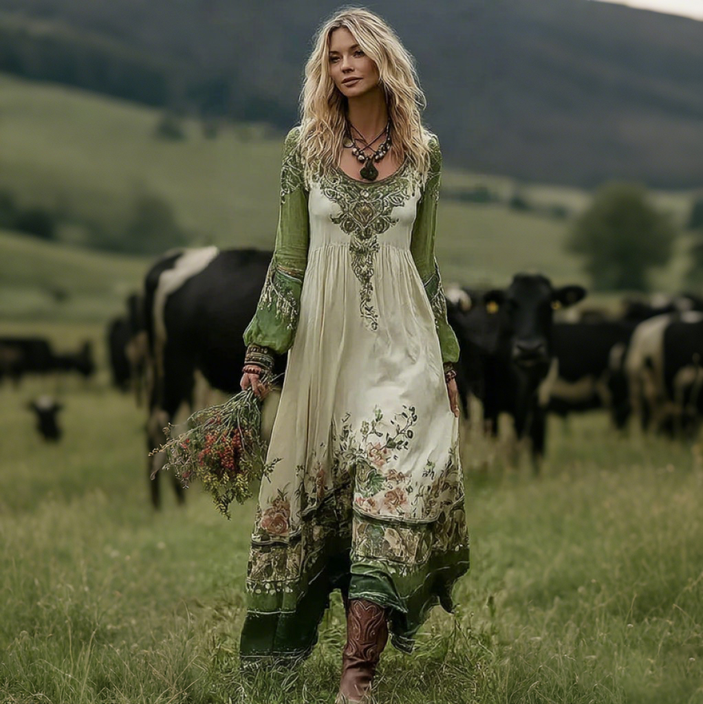 Women's Vintage Floral Pattern Art Comfy Linen V-neck Dress