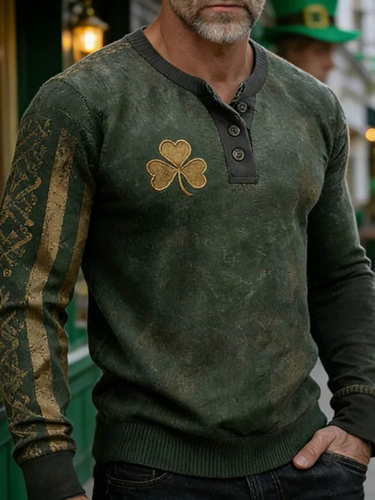 Men's Shamrock Print Long Sleeve Henley T-shirt