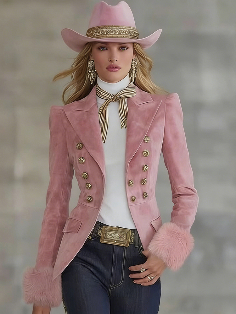 Retro Slim Fit Fur Trim Suede Suit Jacket