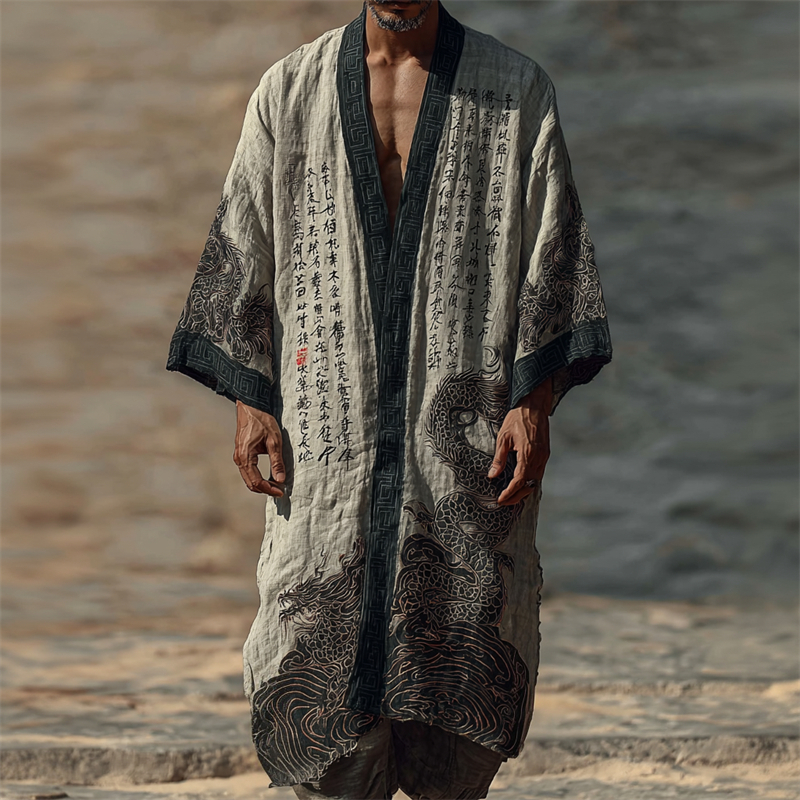 Men's Japanese Dragons Calligraphy Linen Long Kimono