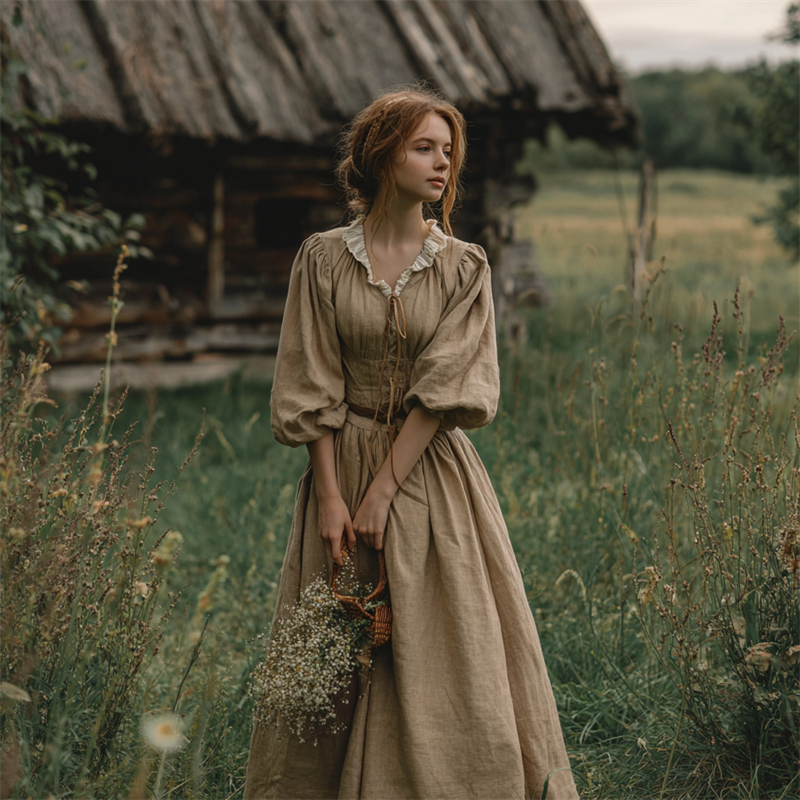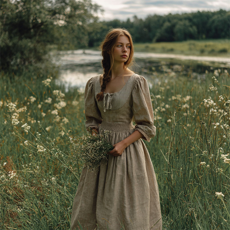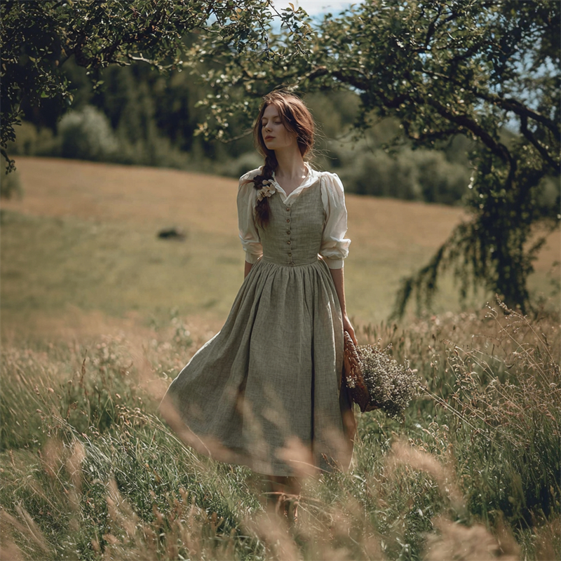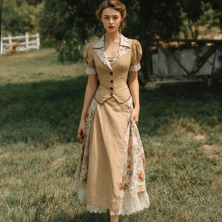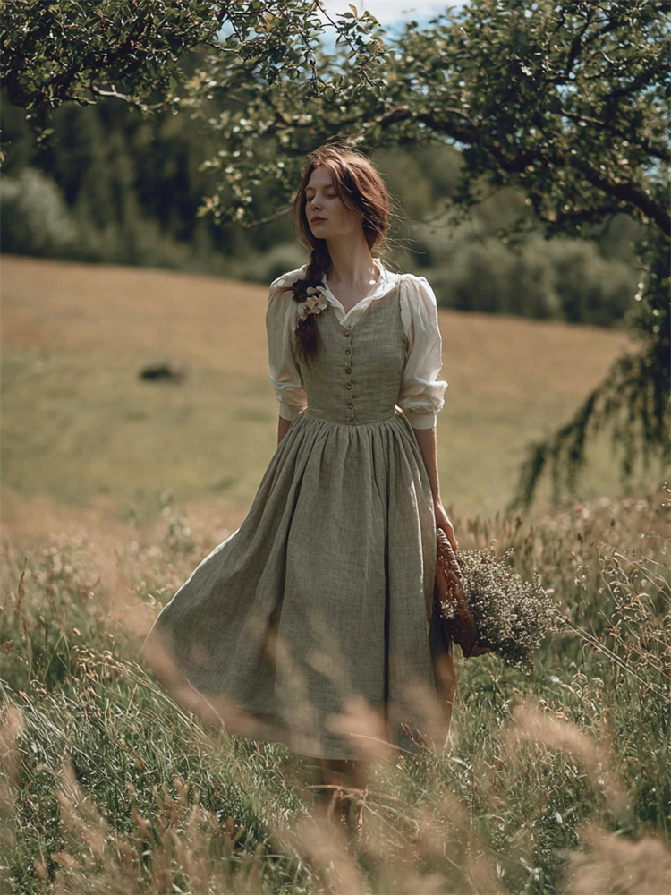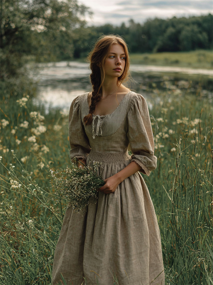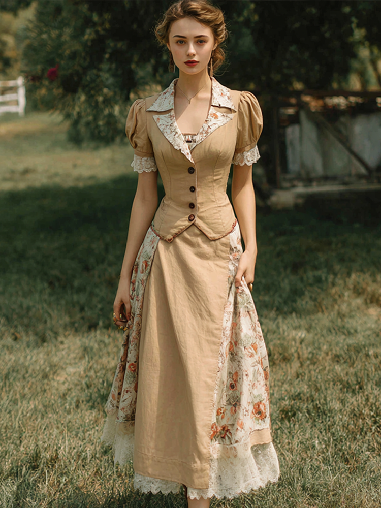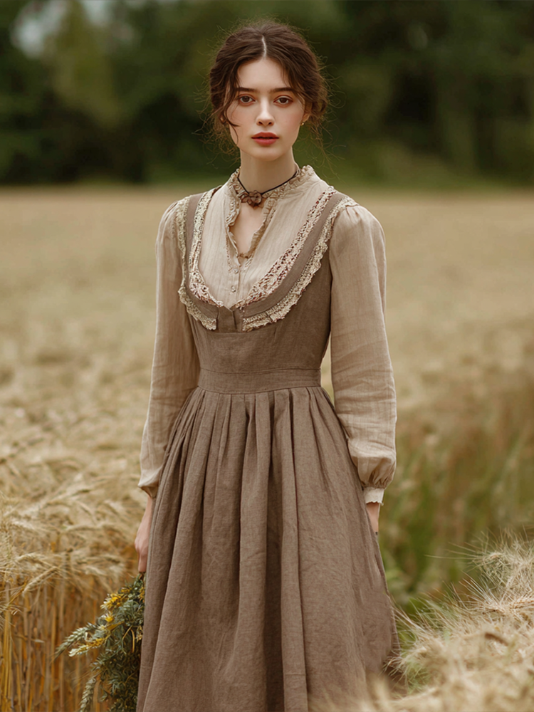 Retro Linen Lace Patchwork French Countryside Style Waist-cinching Dress