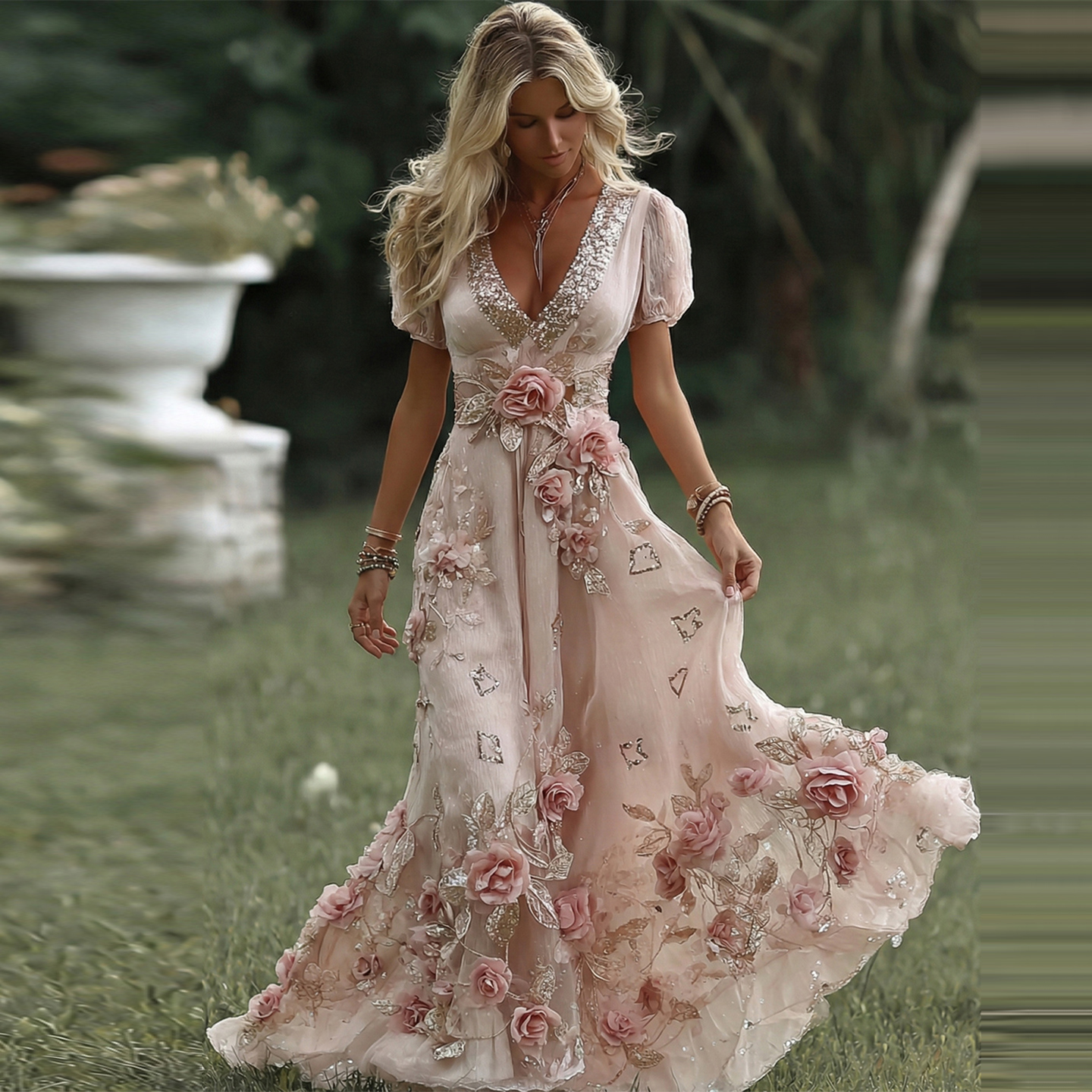 Women's Vintage Pink Rose Embroidered Art Pattern V-neck Short Sleeve Midi Dress