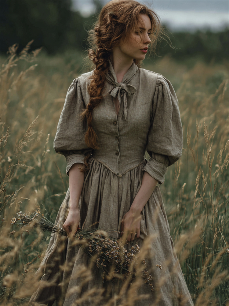Vintage Tied Button Up Puff Sleeve Linen Maxi Dress
