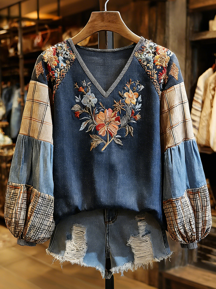 Retro Boho Floral With Plaid Denim Patchwork Pattern Women's Top