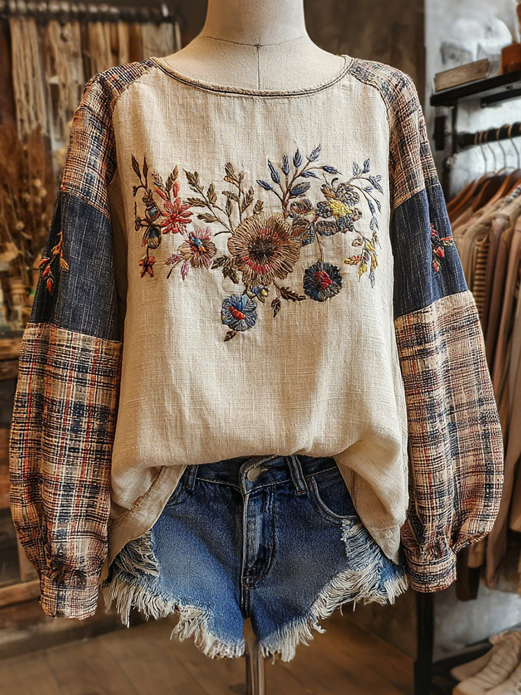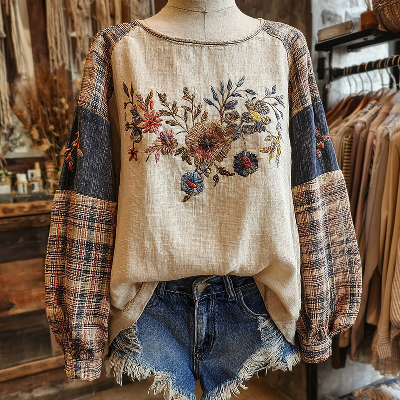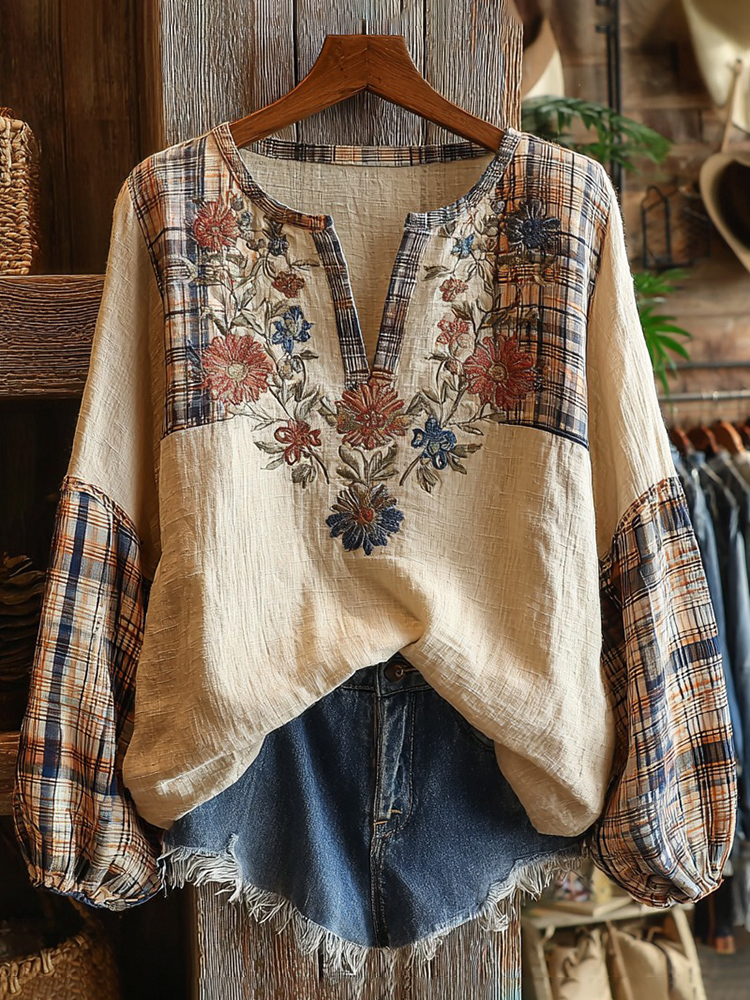 Retro Boho Floral With Plaid Patchwork Pattern Women's Top