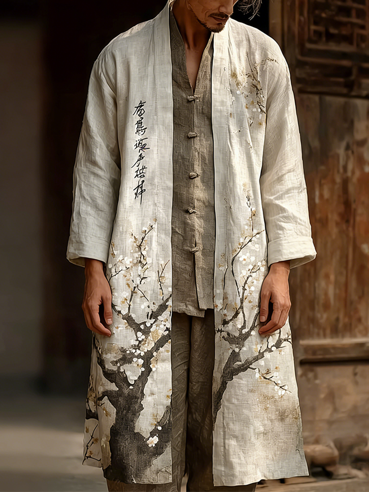 Men's White Cherry Blossom Pattern Casual Linen Long Kimono