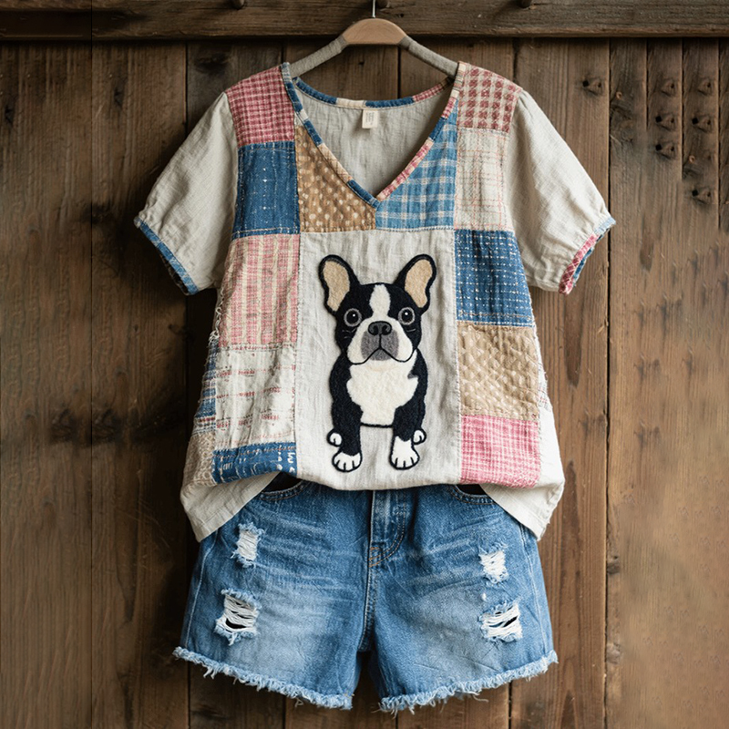 Women's Retro Patchwork Dog Print T-shirt
