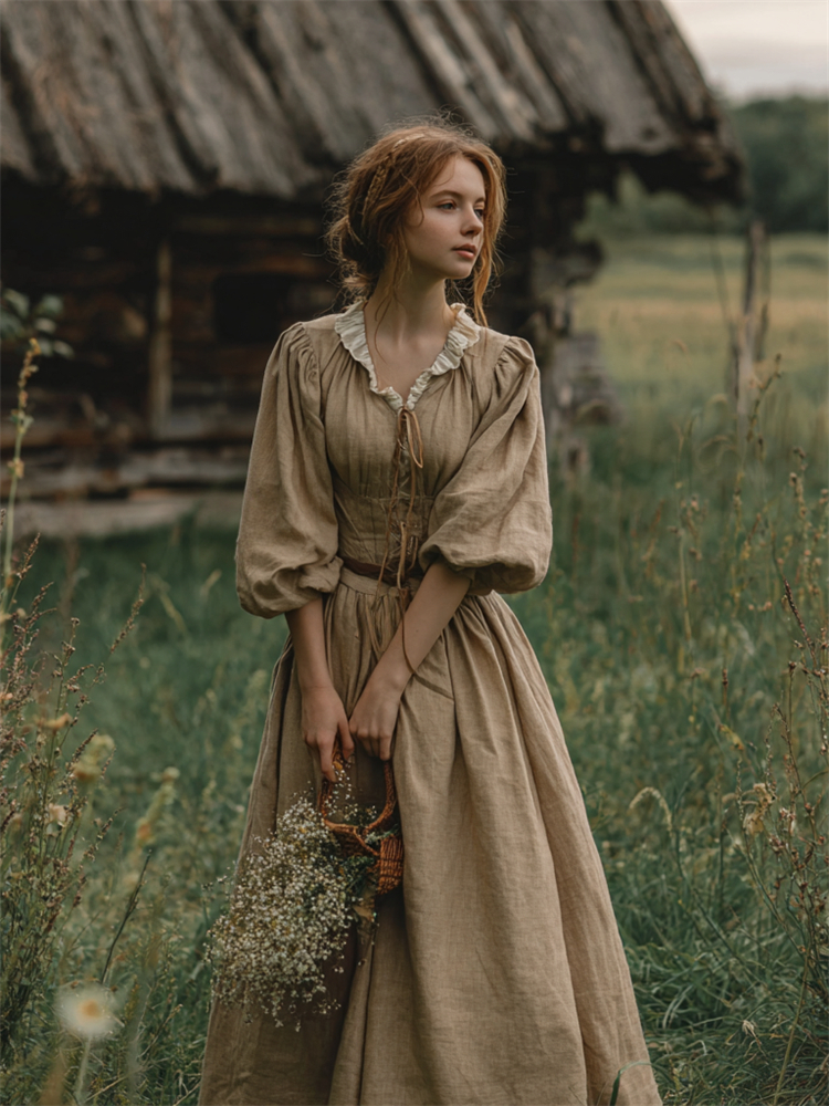 Vintage Ruffle V Neck Laced Puff Sleeve Linen Maxi Dress