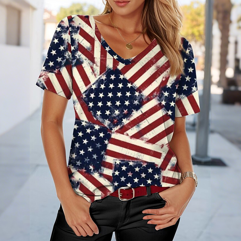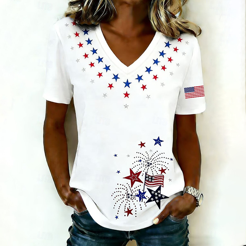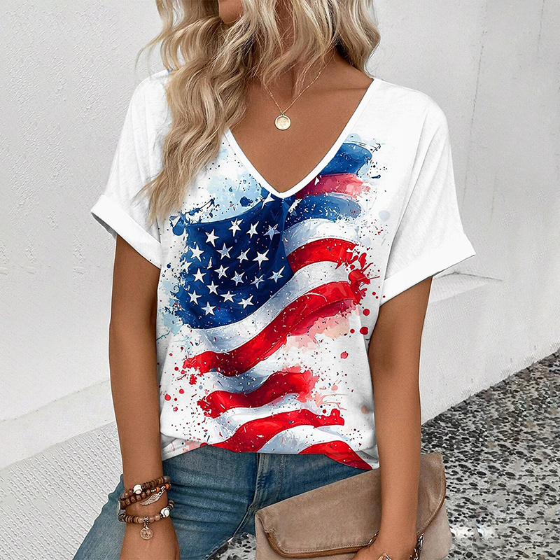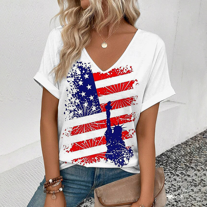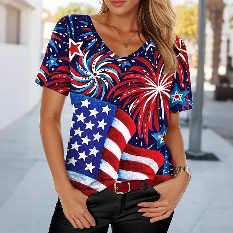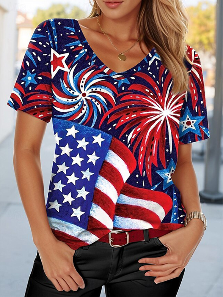 Women's American 250th Anniversary Art Print Casual V Neck Linen Tops