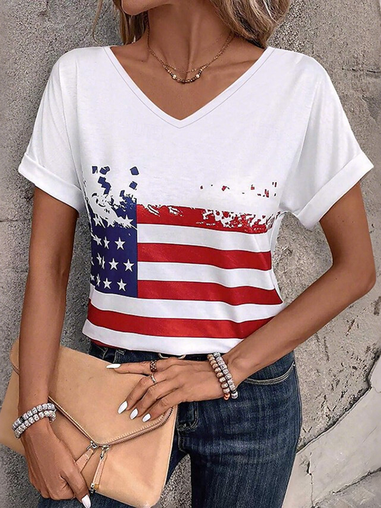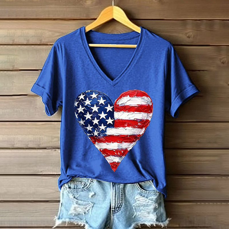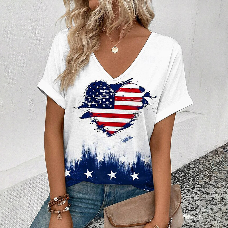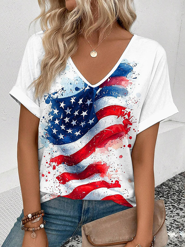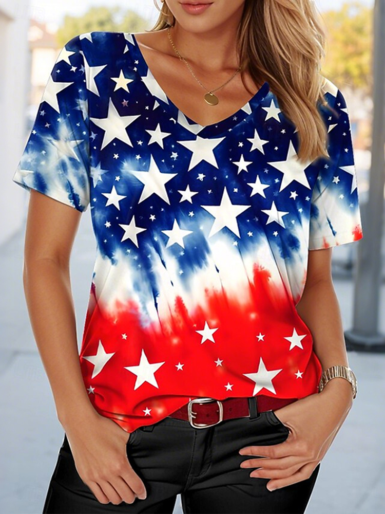 Women's American 250th Anniversary Art Print Casual V Neck Linen Tops