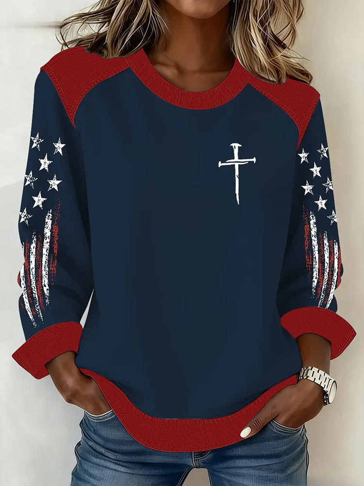 Women's Vintage American Flag Inspired Faith Cross Print Sweatshirt