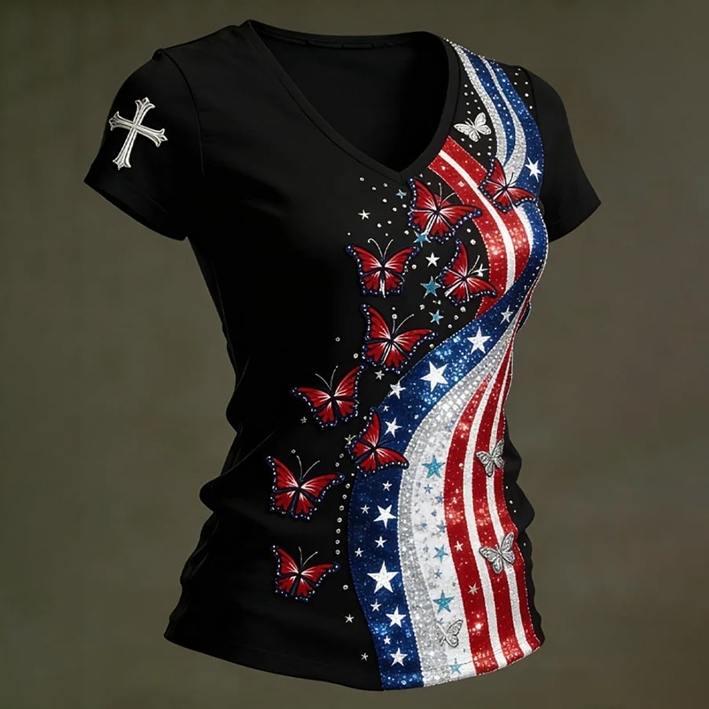 Women's American 250th Anniversary Three-quarter Sleeve V Neck Linen Tops