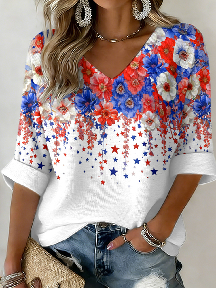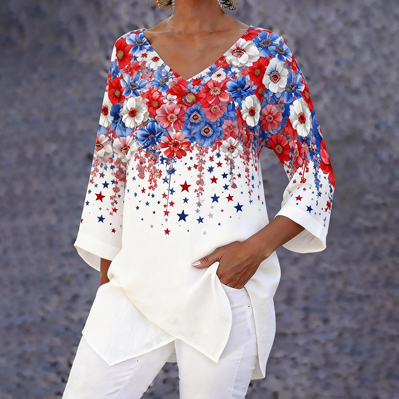 Women's Casual Red, Blue And White Floral American 250th Anniversary Three-quarter Sleeve V Neck Linen Tops