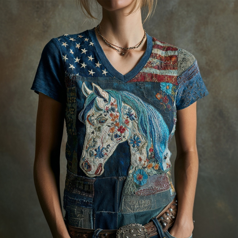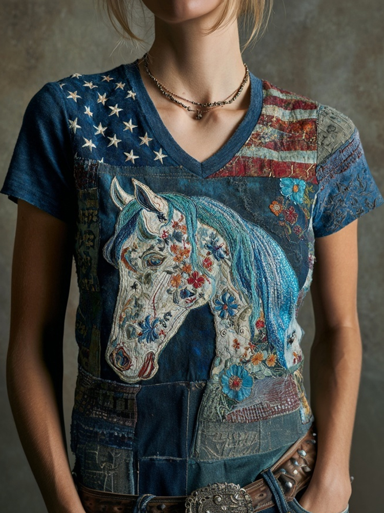 Western Floral Horse & American Flag Patchwork T Shirt