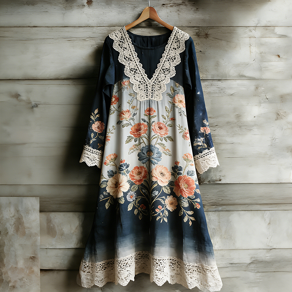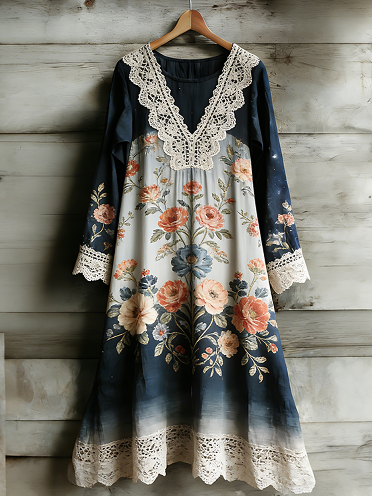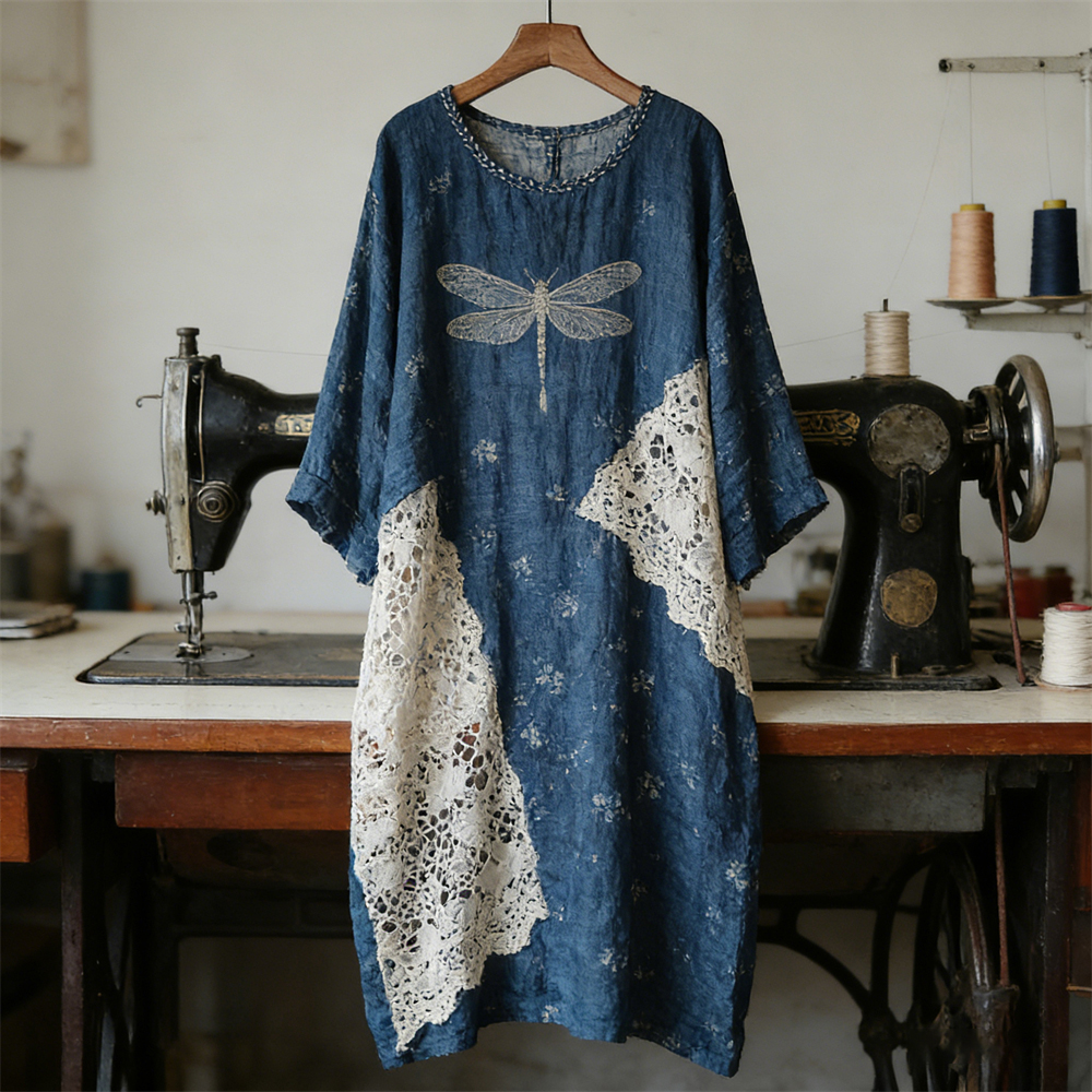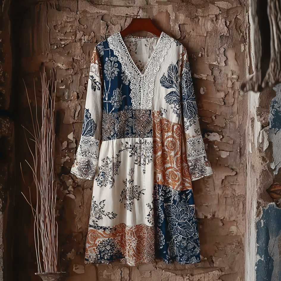 Boho Dragonfly Lace Patchwork Floral Linen Women's Long Sleeve Midi Dress