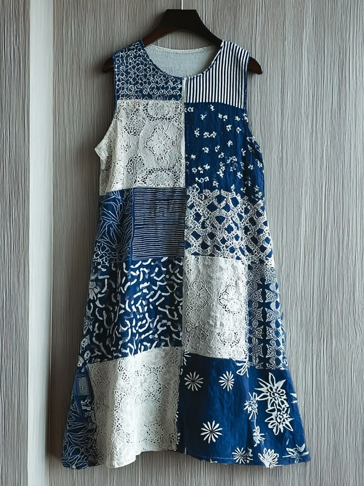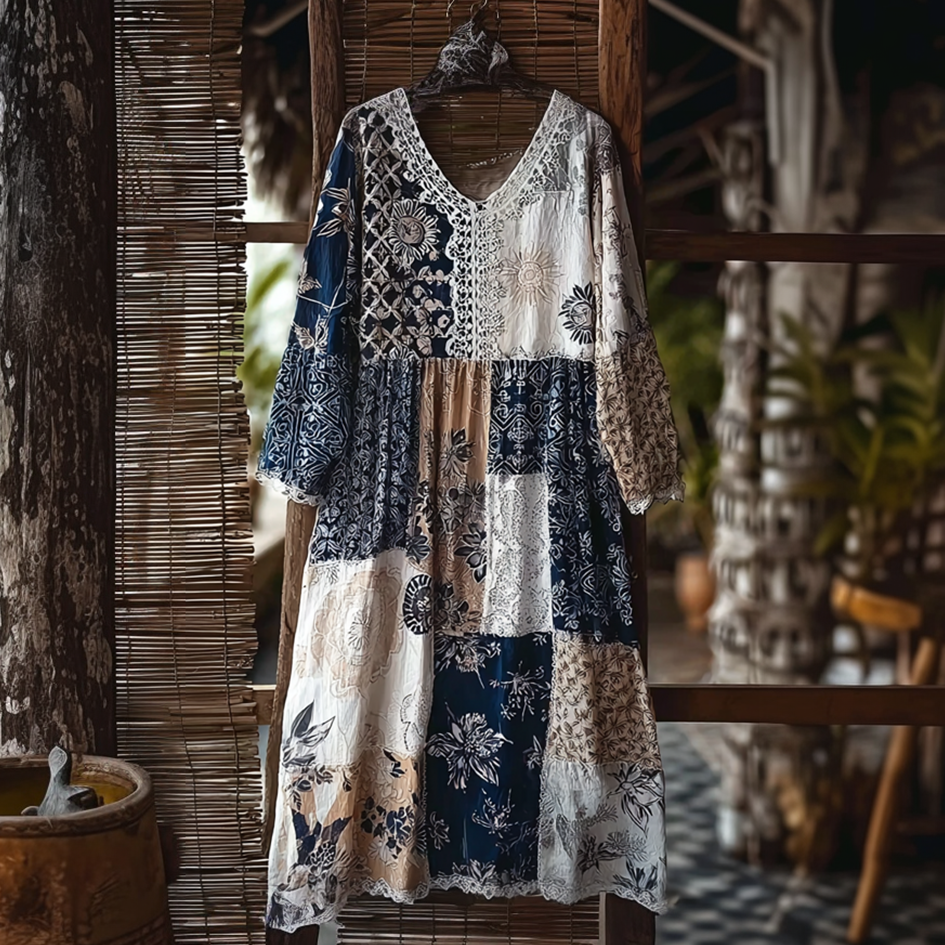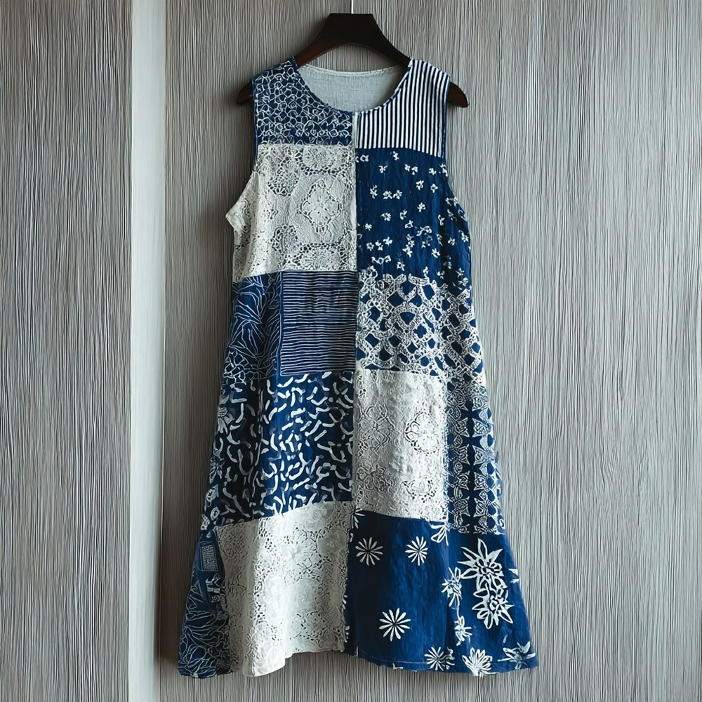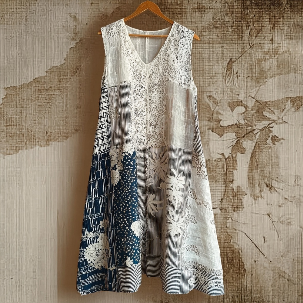 Vintage Japanese Inspired Patchwork Linen Midi Dress