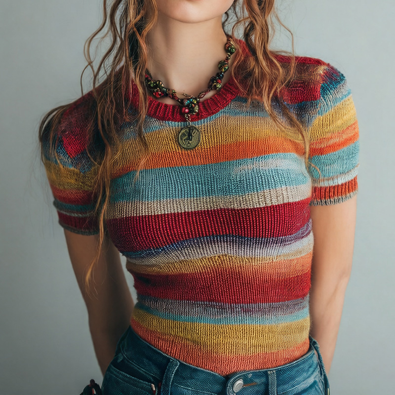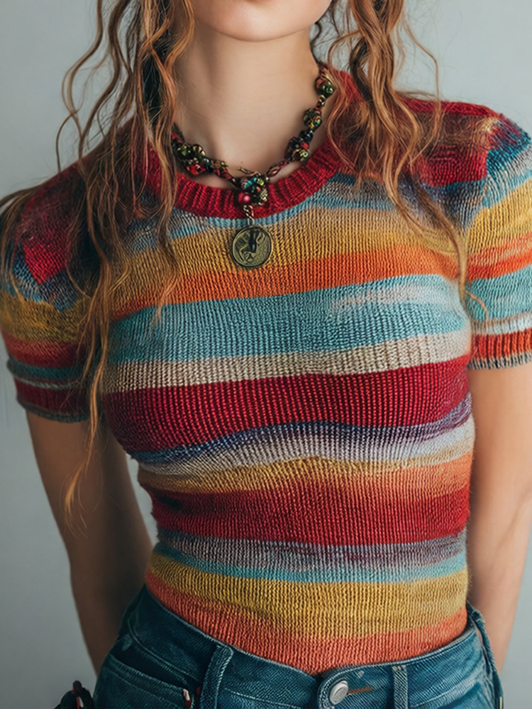 Women's Rainbow Embroidered Art Print Short Sleeve Sweater