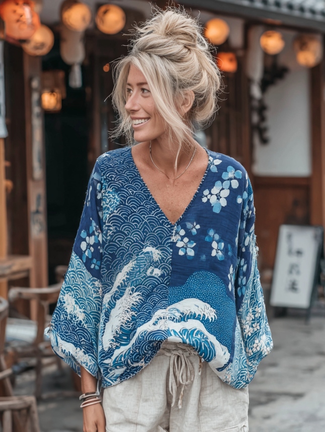 Women's Vintage Japanese Traditional Sashiko And Wave Patchwork Art Print Linen Tops