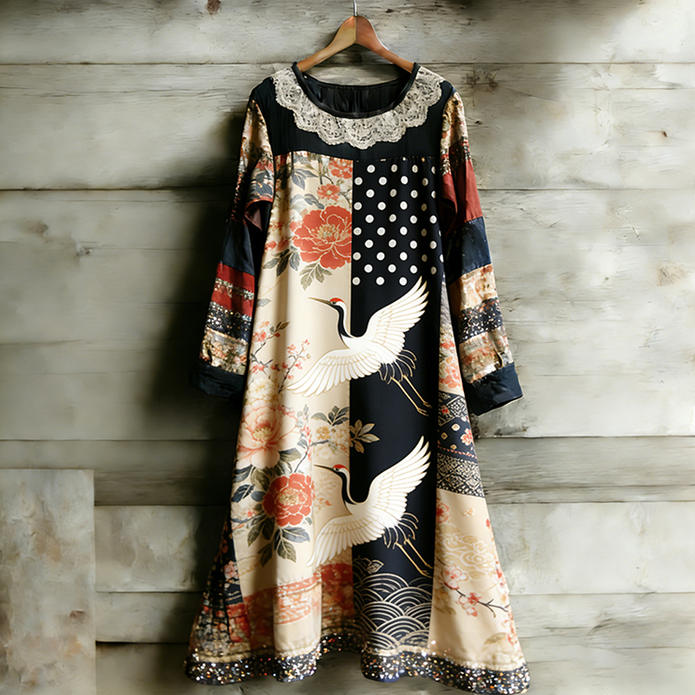 Women's Vintage Floral Flying Crane Lace Round Neck Dress