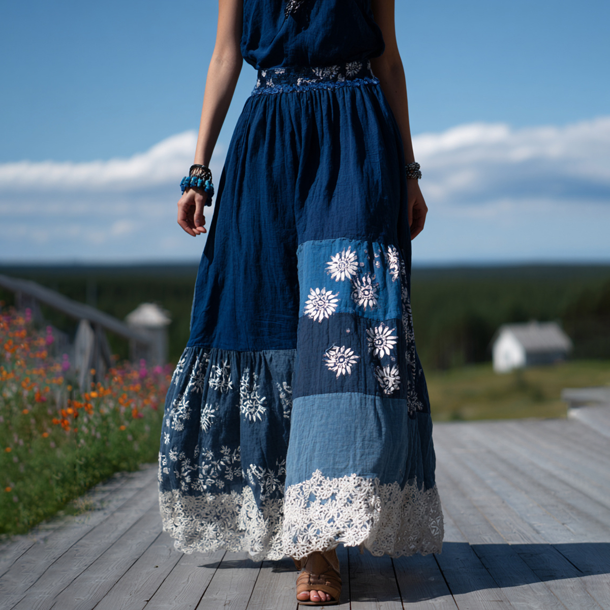 Japanese Waves Patchwork Hollow Lace Flowy Maxi Dress
