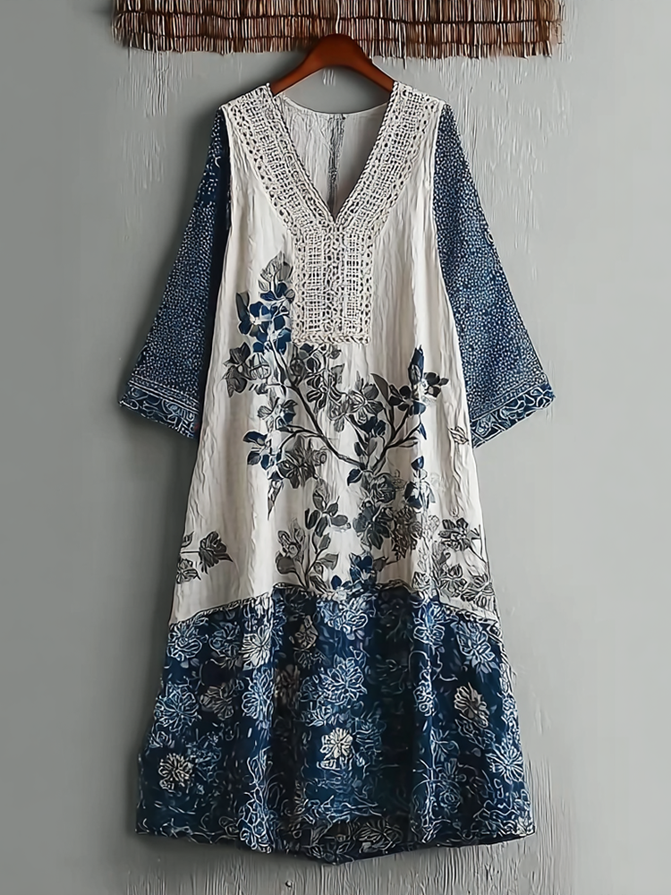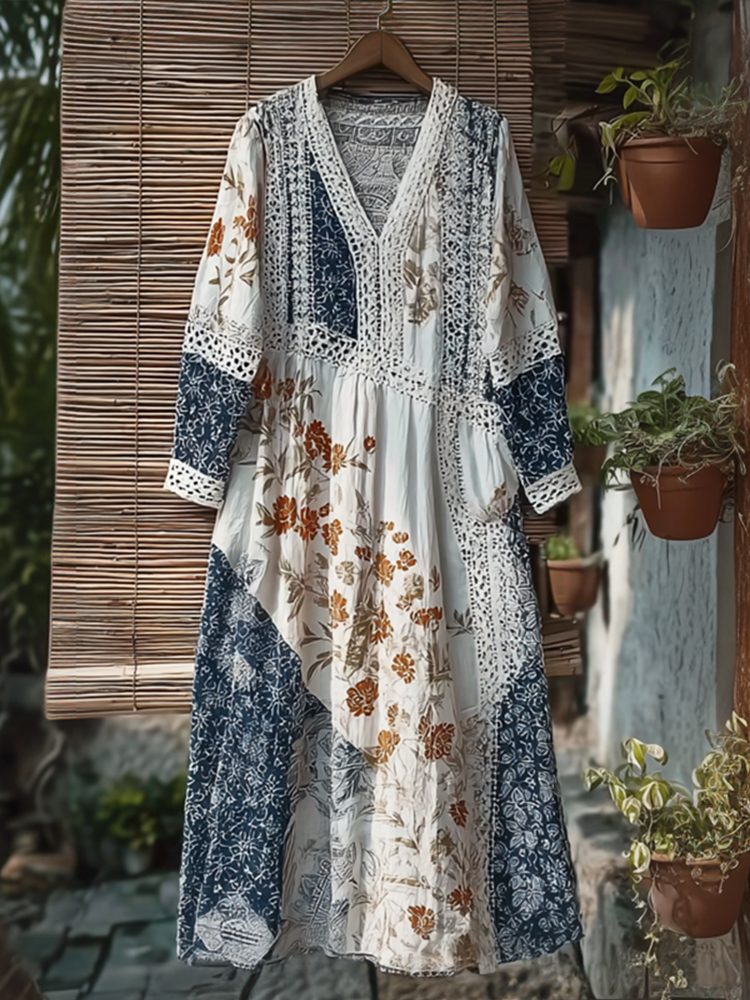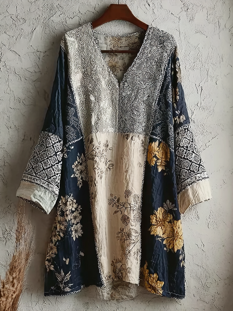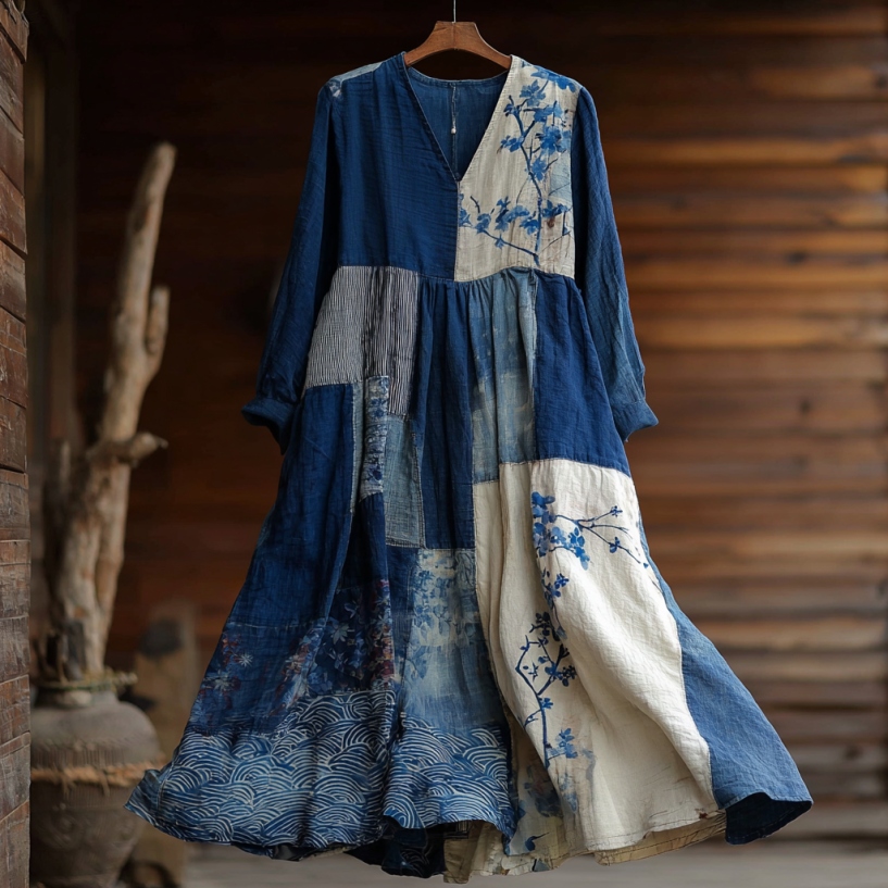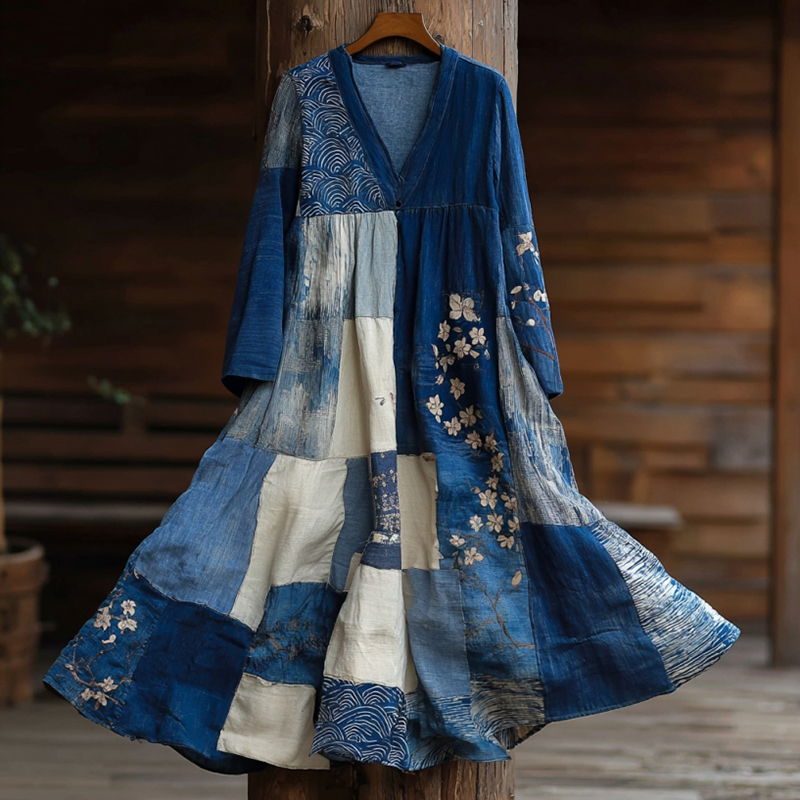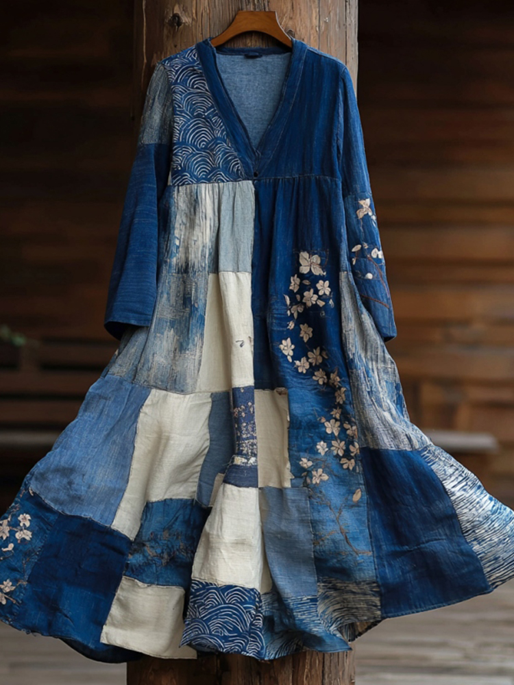 Japanese Art Retro Style Plant And Flower Pattern Patchwork Design V-neck Cotton And Linen Dress