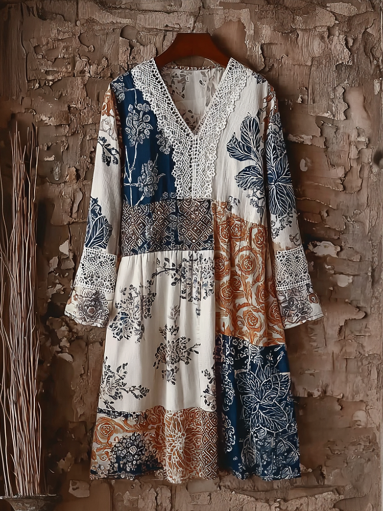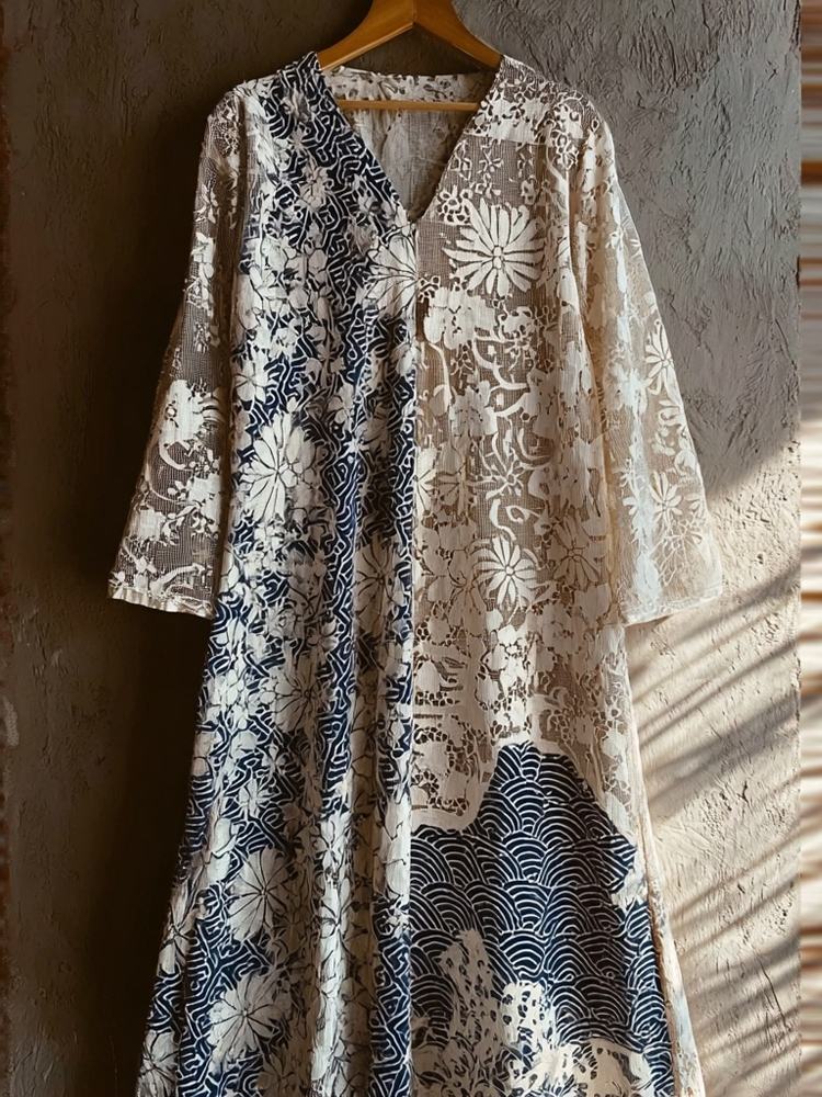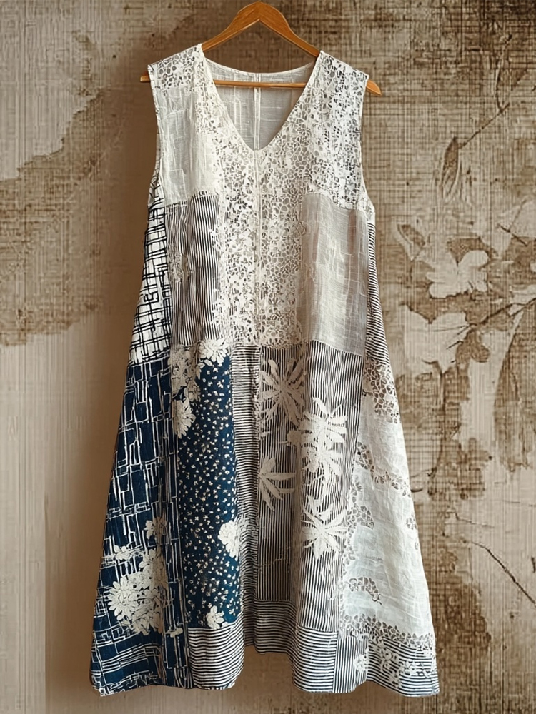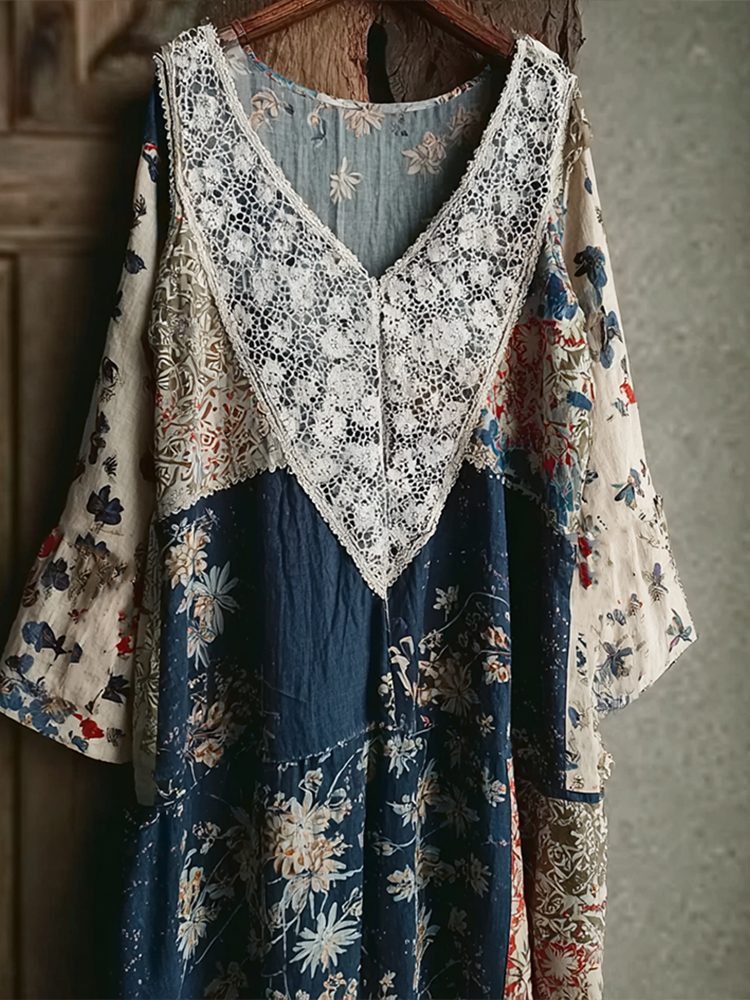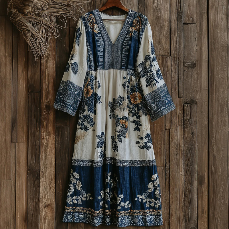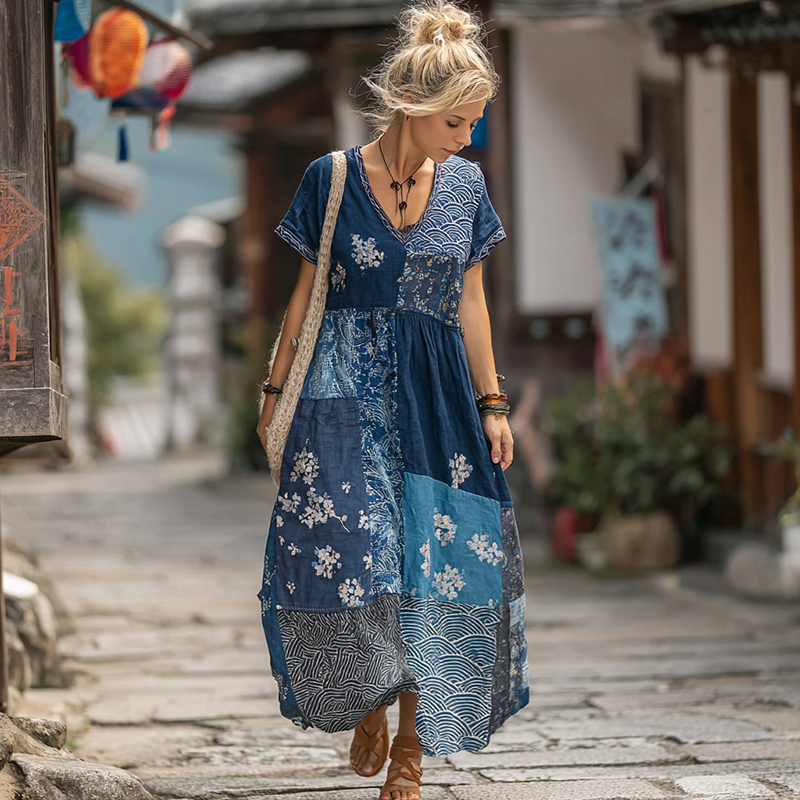 Japanese Art Retro Style Plant And Flower Pattern Patchwork Design V-neck Cotton And Linen Dress