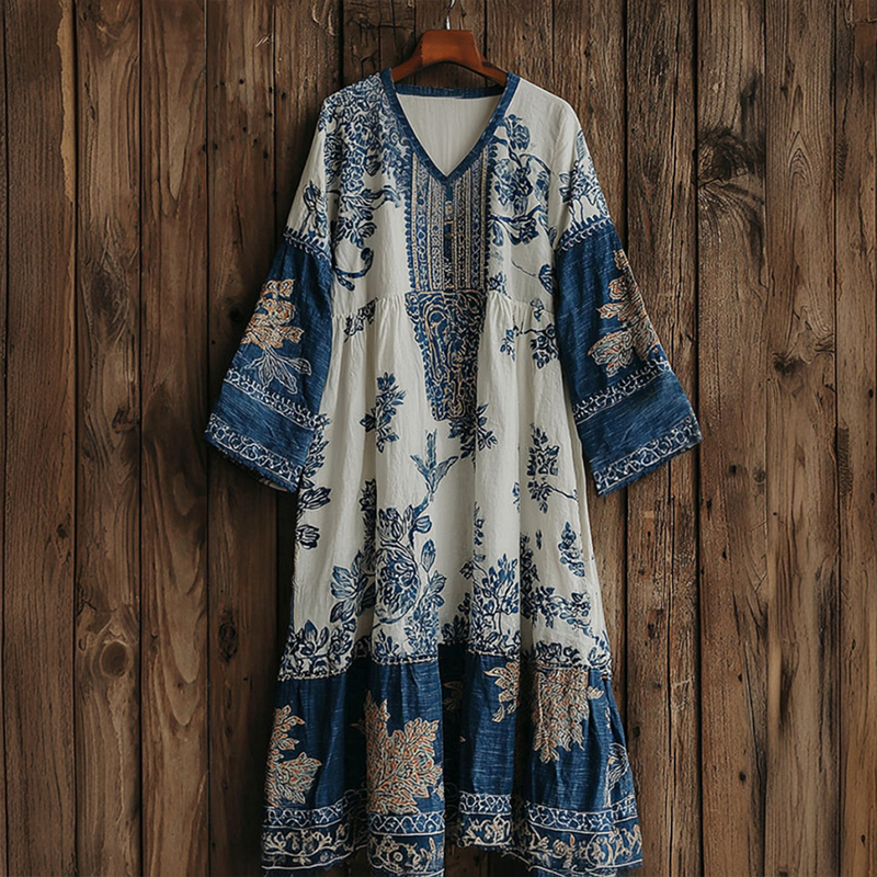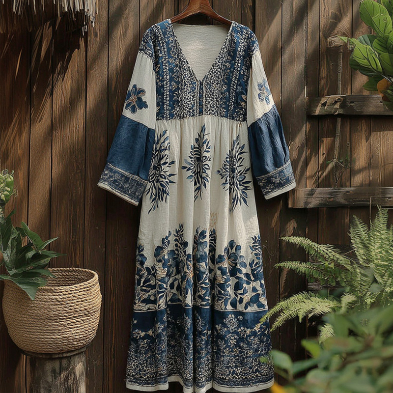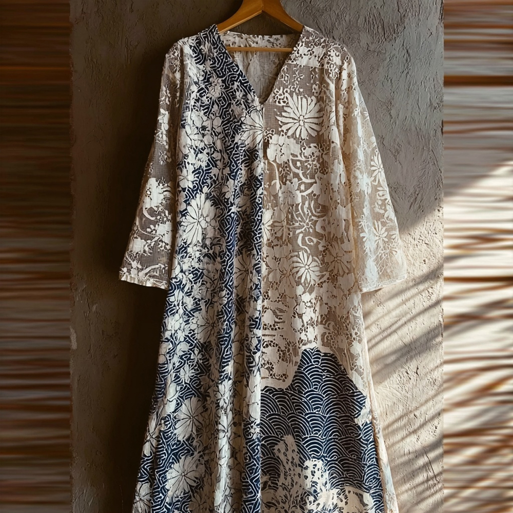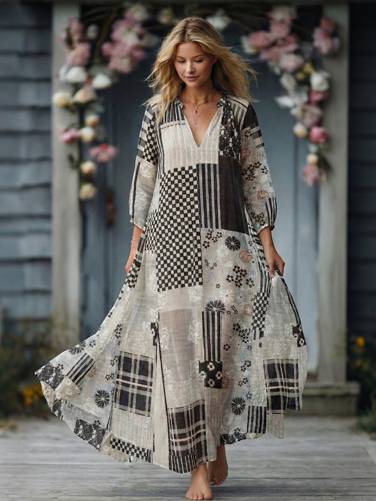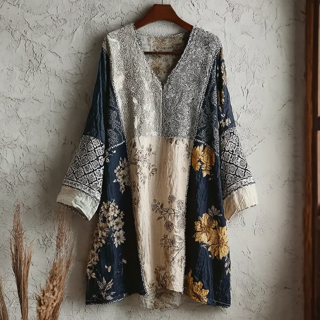 Japanese Art Retro Style Plant And Flower Pattern Patchwork Design V-neck Cotton And Linen Dress