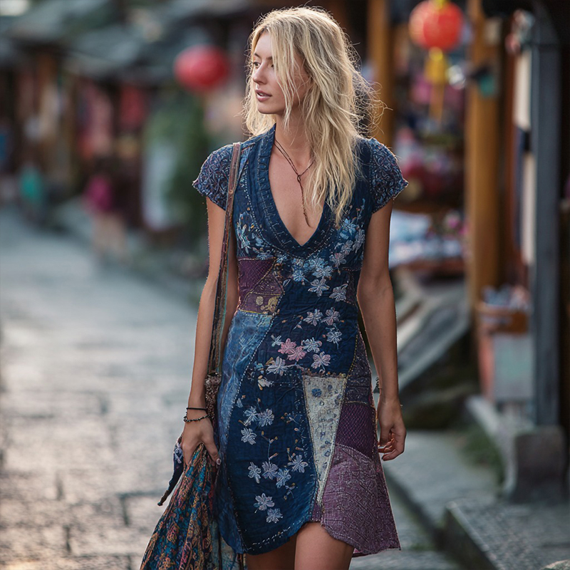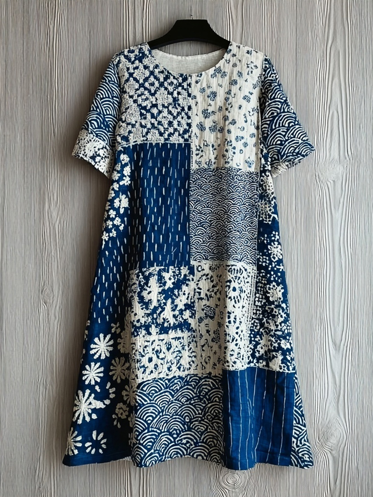 Women's Japanese Sashiko And Floral Pattern Linen Short-sleeved Dress
