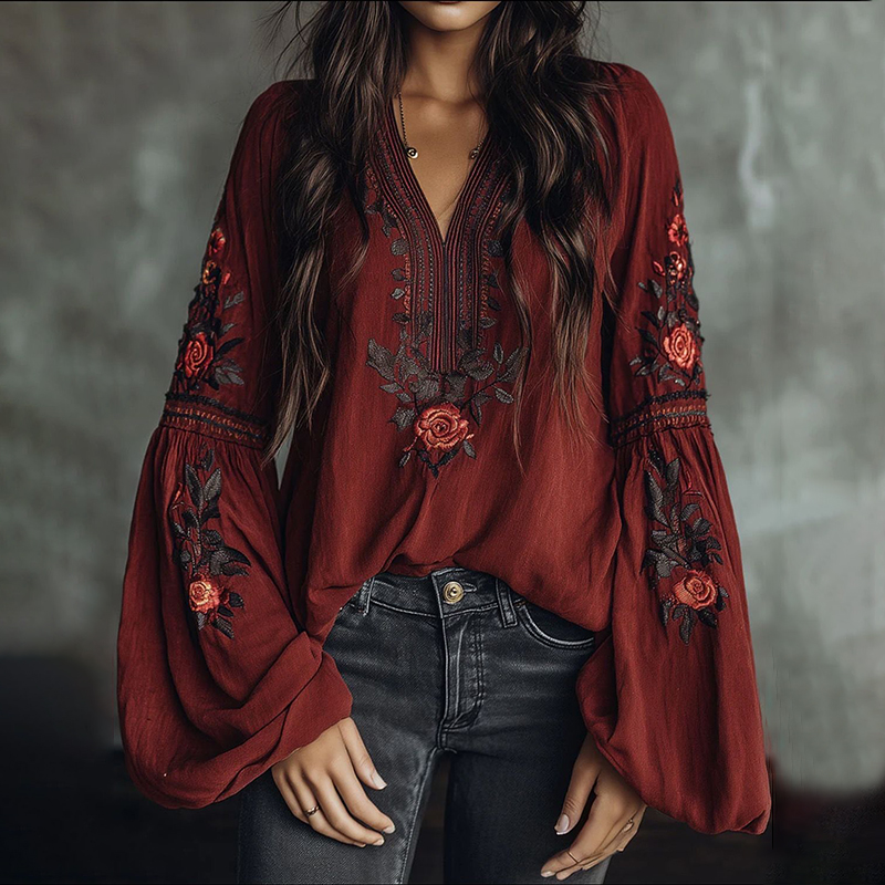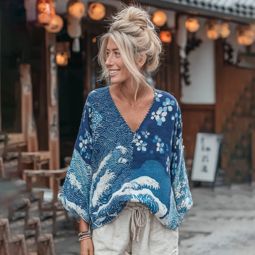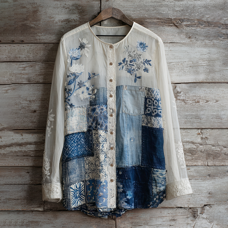 Women's Japanese Traditional Sashiko Floral Patchwork Art V-neck Shirt