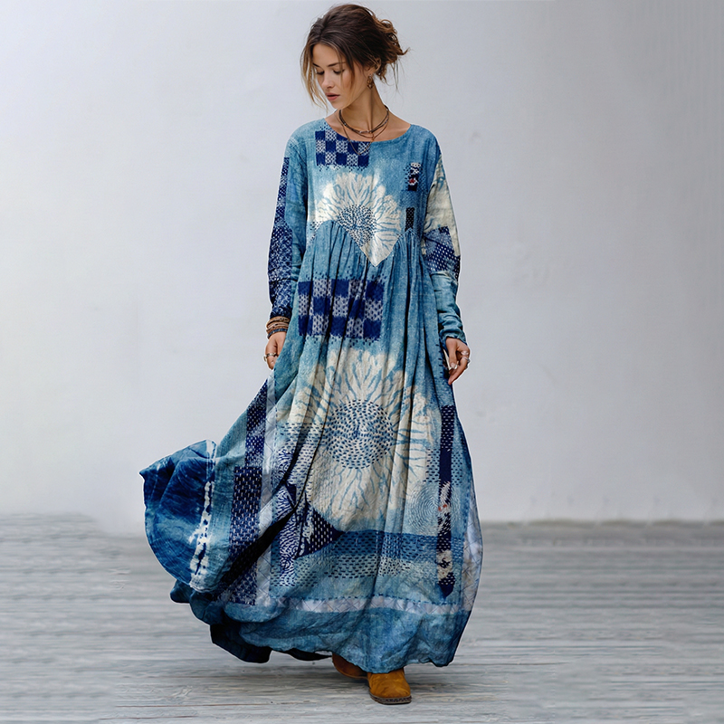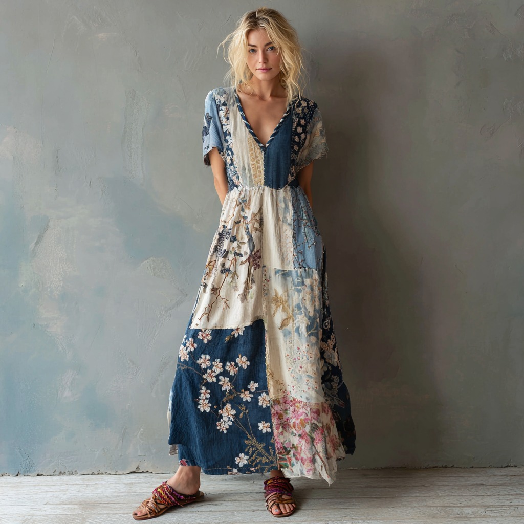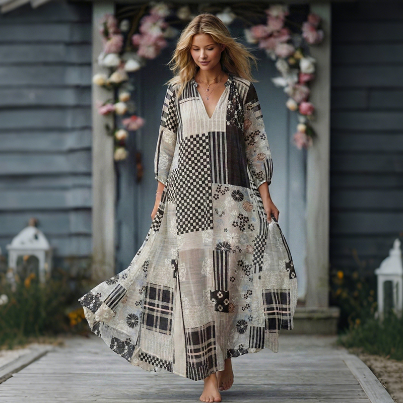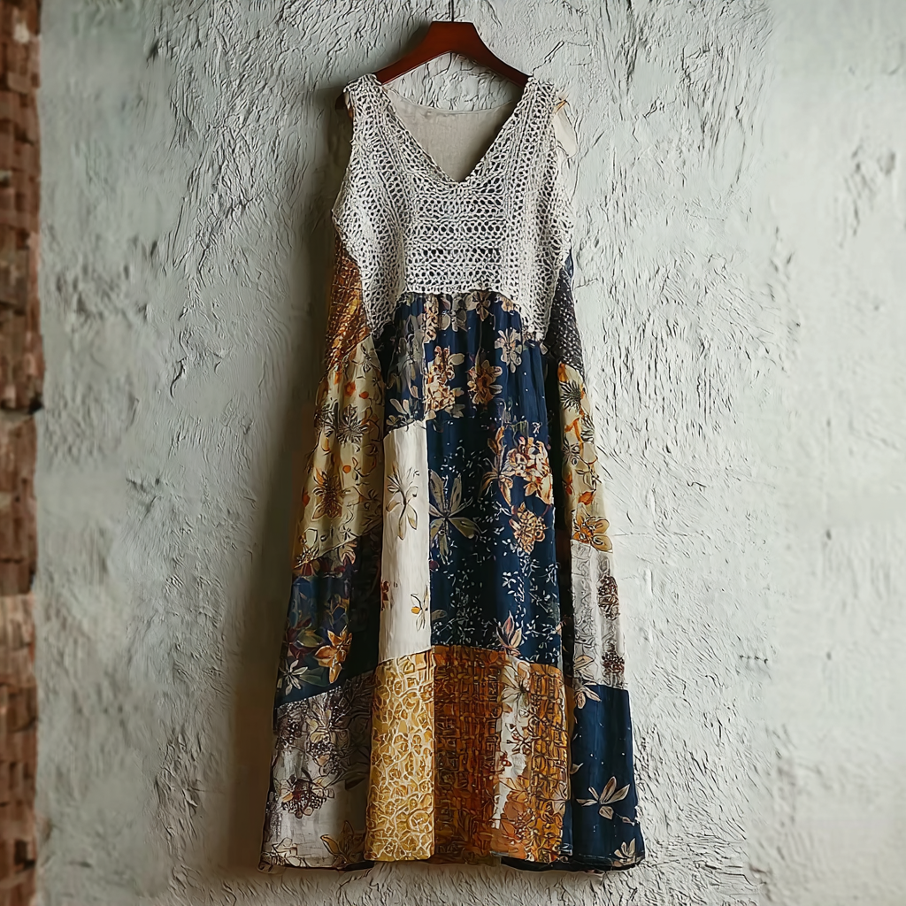 Women's Floral Patchwork Vintage Linen Maxi Dress