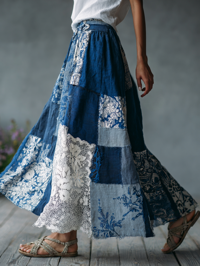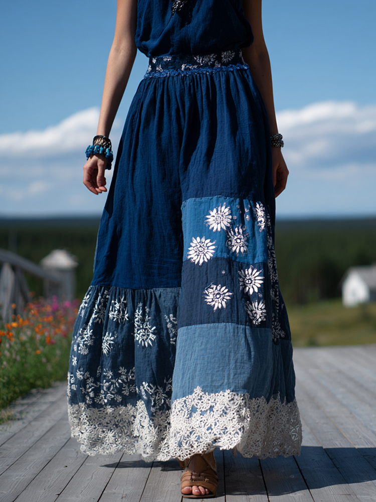 Women's Retro Floral Lace Embroidery Patchwork Art Linen Blend Casual Midi Skirt