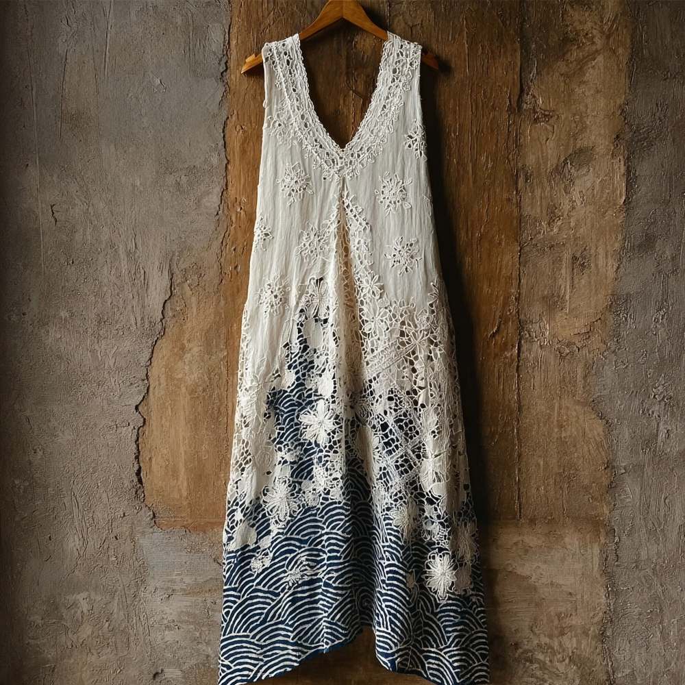 Japanese Waves Patchwork Hollow Floral Lace Maxi Tank Dress
