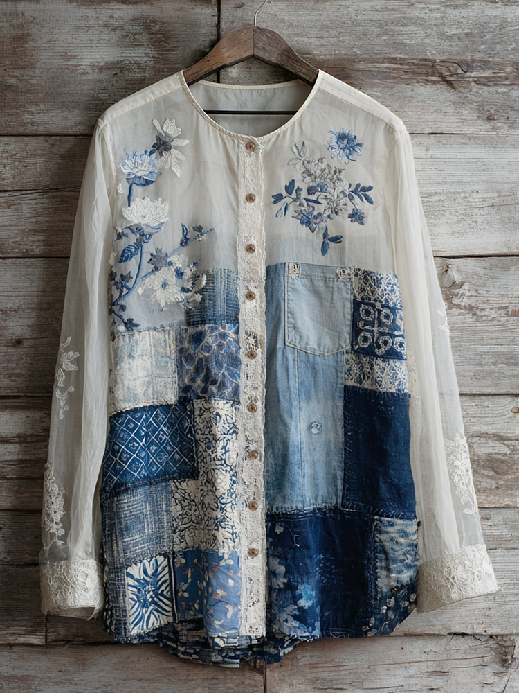 Vintage Lace Floral Embroidery Patchwork Linen Women's Long Sleeve Shirt