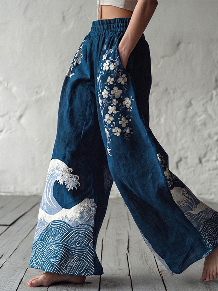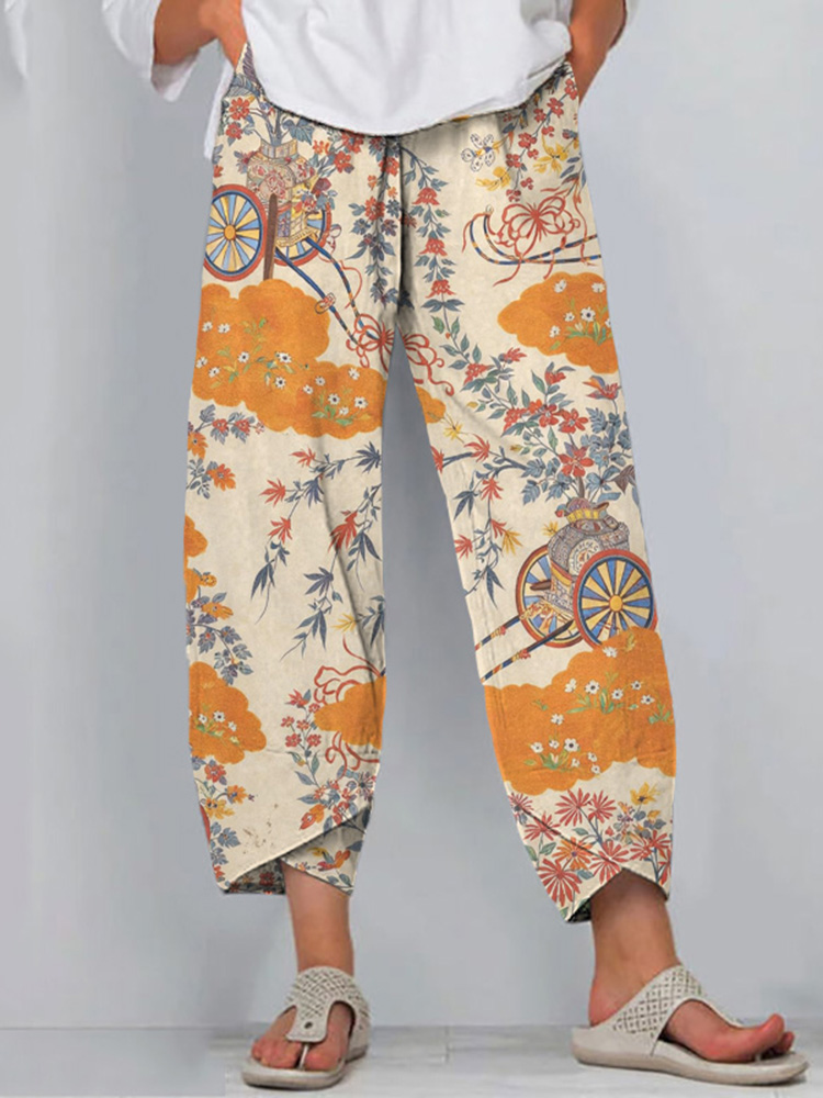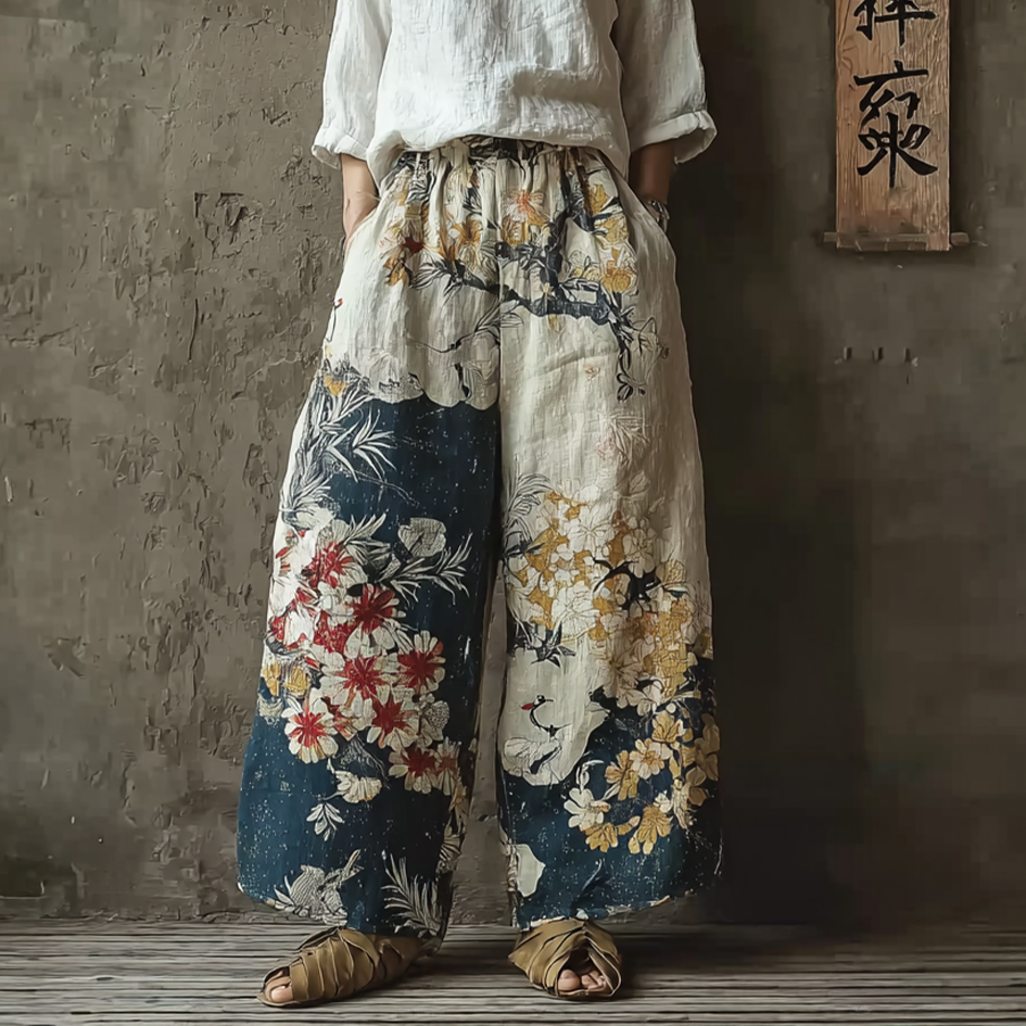 Women's Japanese Floral Art Print Linen Blend Casual Pants