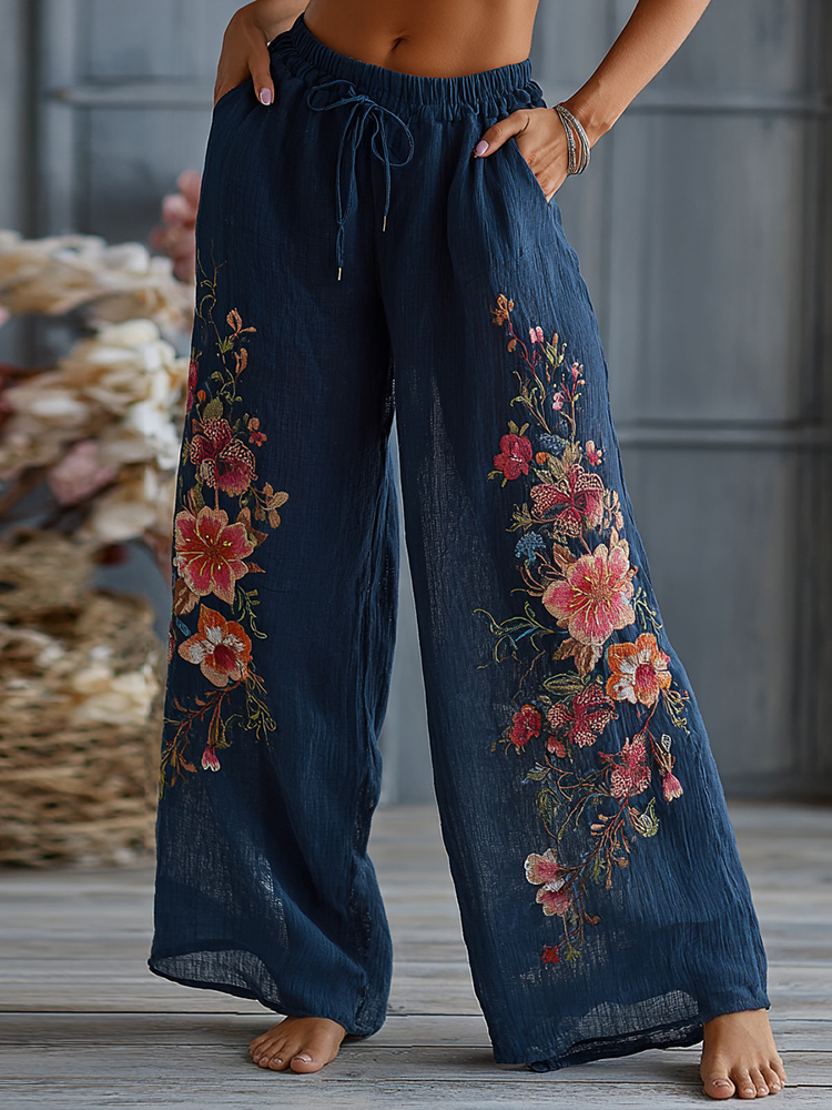 Boho Threaded Floral Geometric Patchwork Embroidered Women's Vintage Linen Trousers