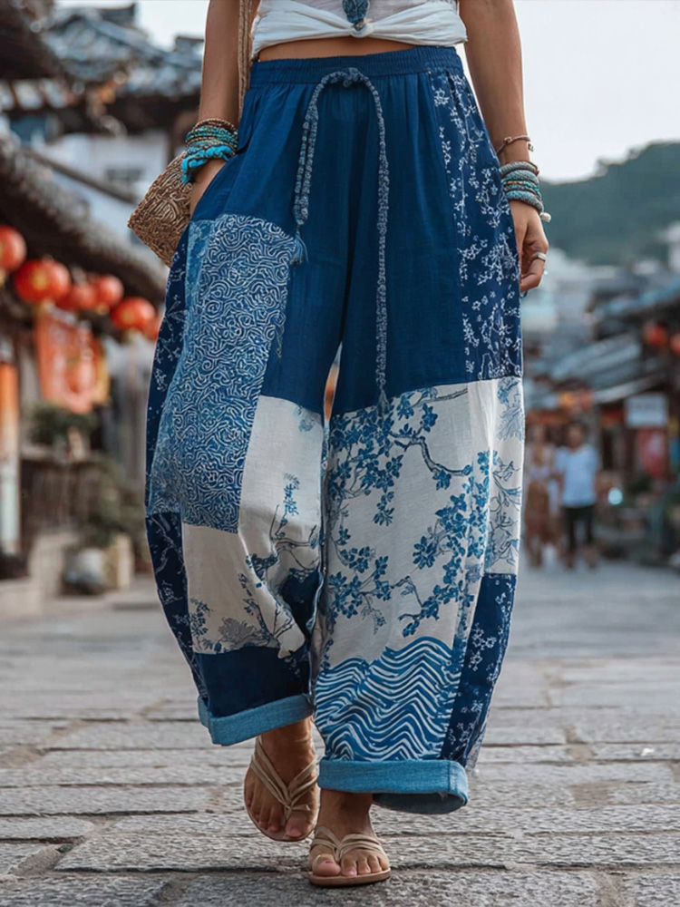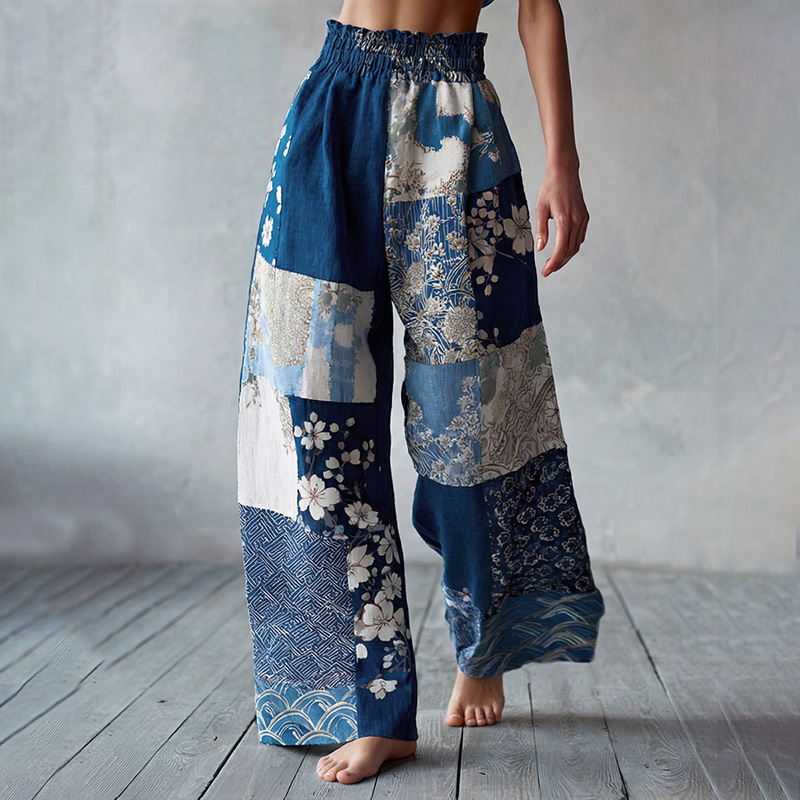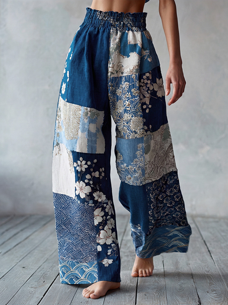 Japanese-style Traditional Sashiko And Wave Patchwork Art Pattern Casual Linen Pants