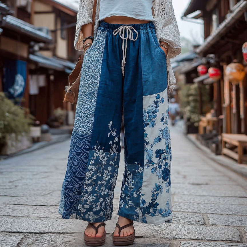 Japanese Style Traditional Sashiko And Wave Patchwork Art Pattern Casual Linen Pants