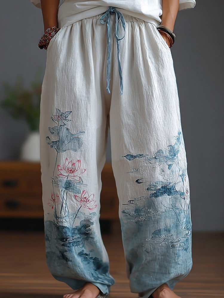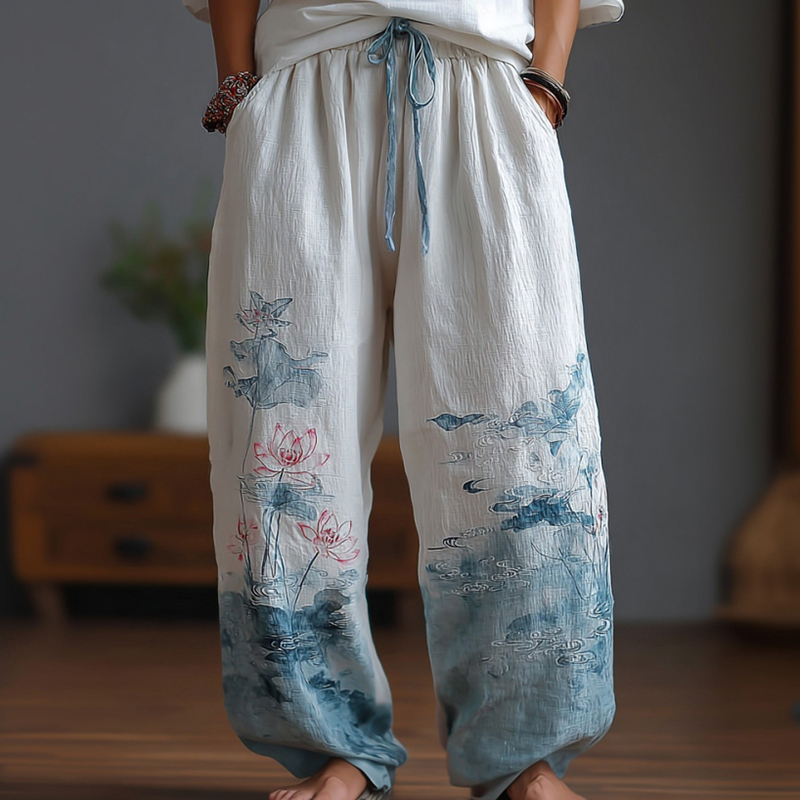 Women's Japanese-style Lotus Pattern Linen Trousers
