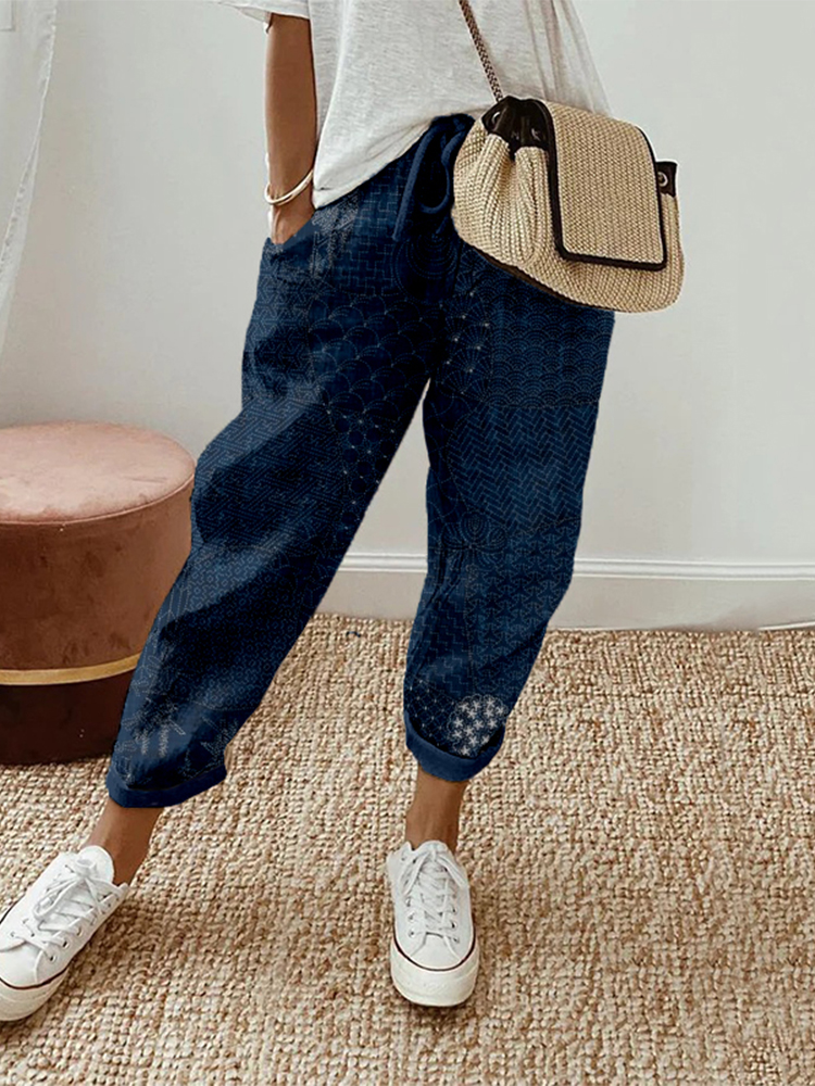 Japanese-style Traditional Sashiko And Wave Art Pattern Casual Linen Pants
