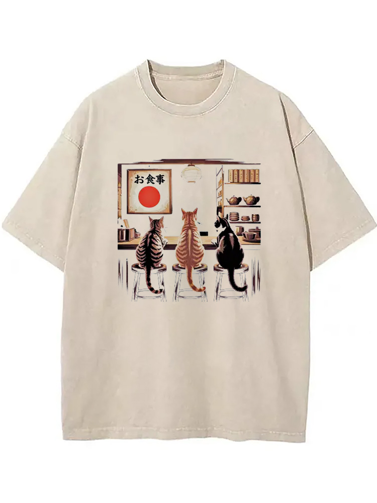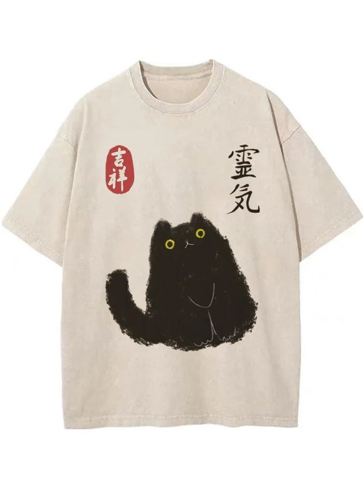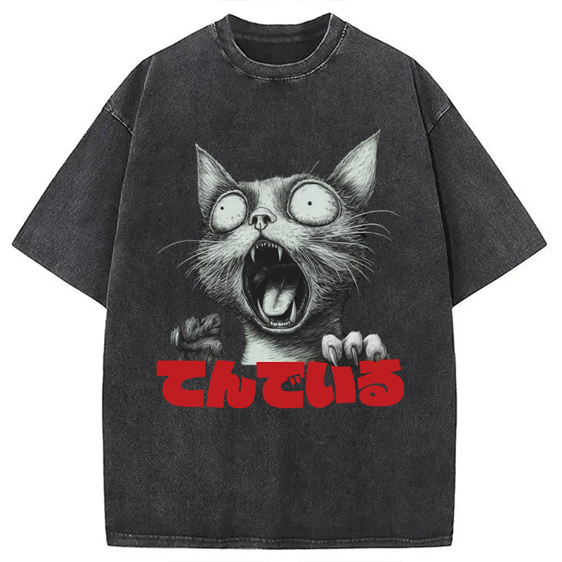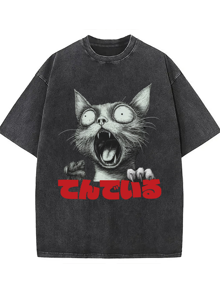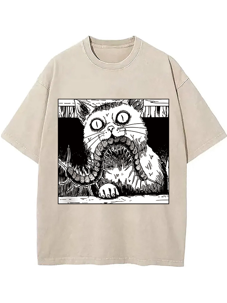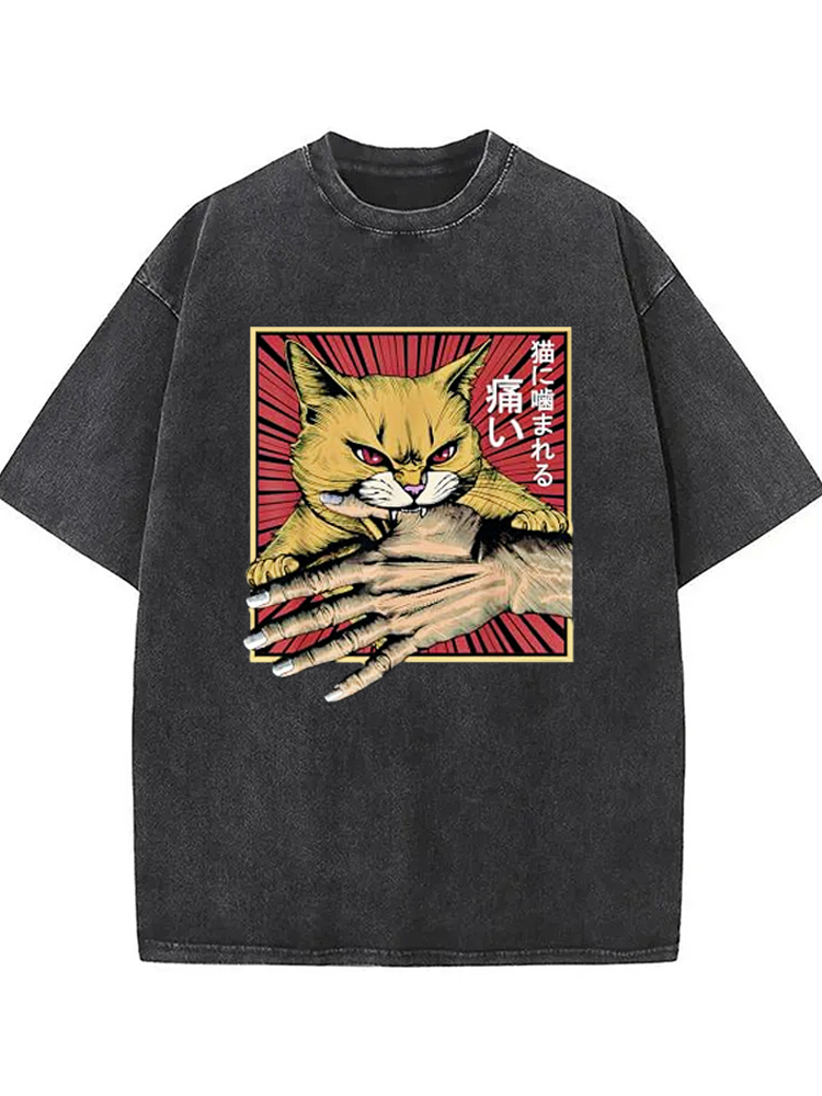 Anime Cat Bite Japanese Art Retro Washed T-shirt
